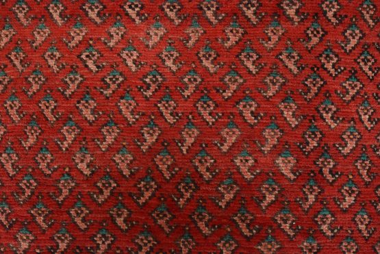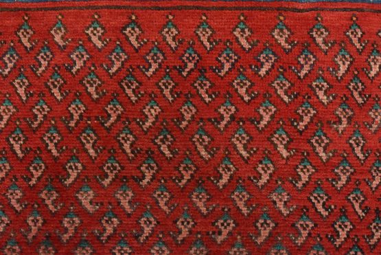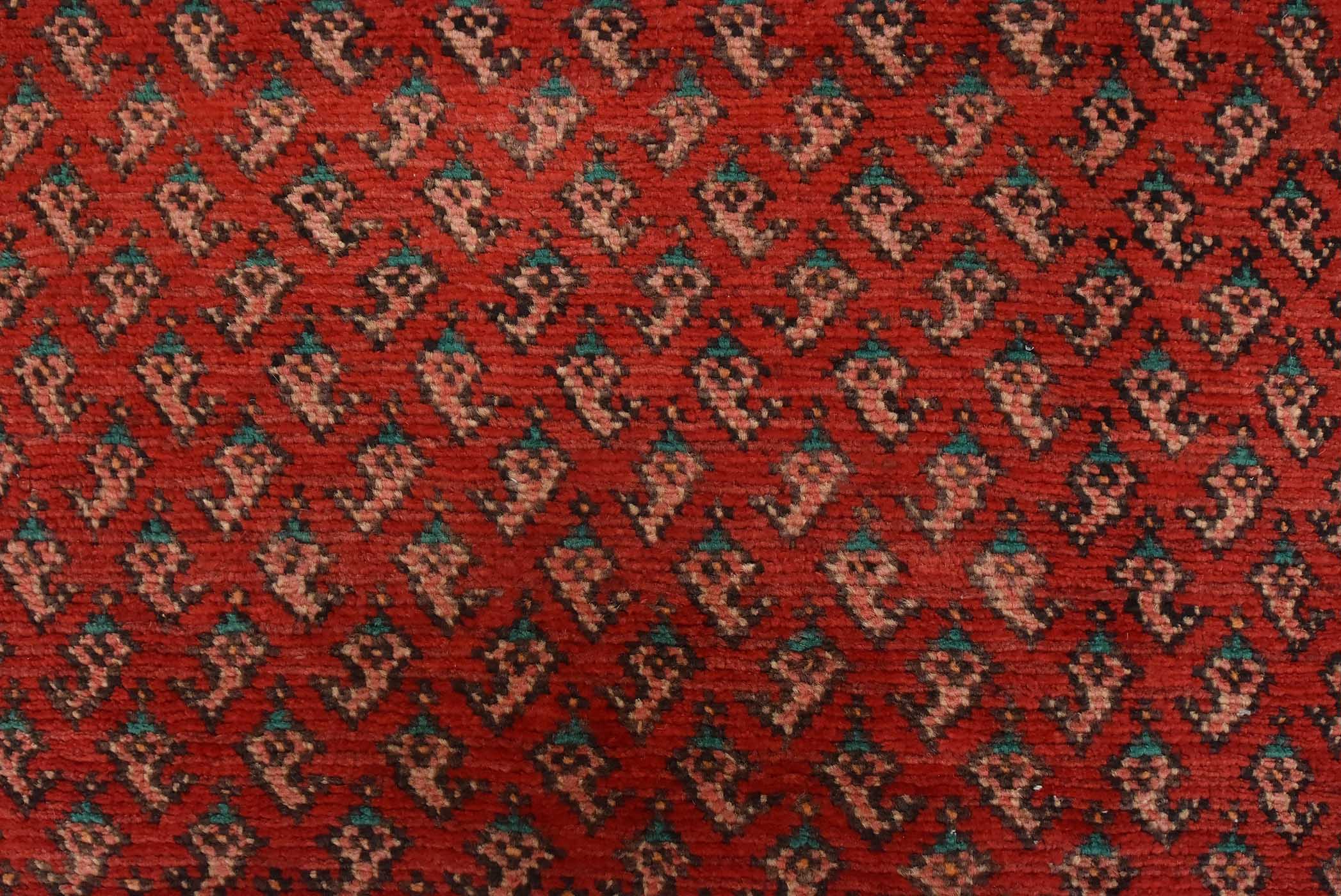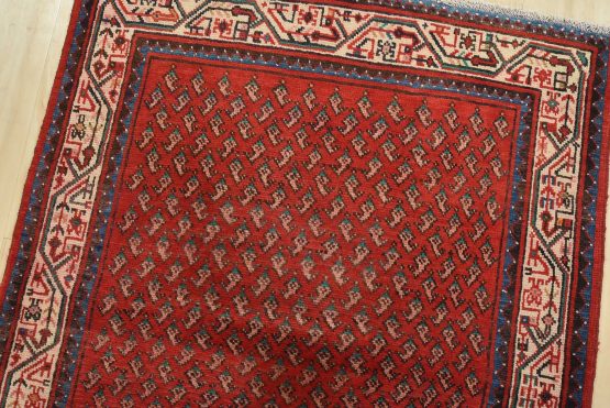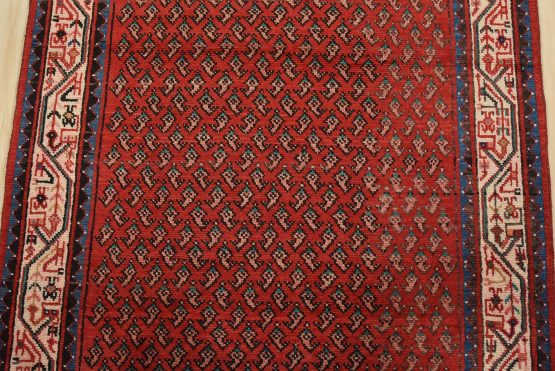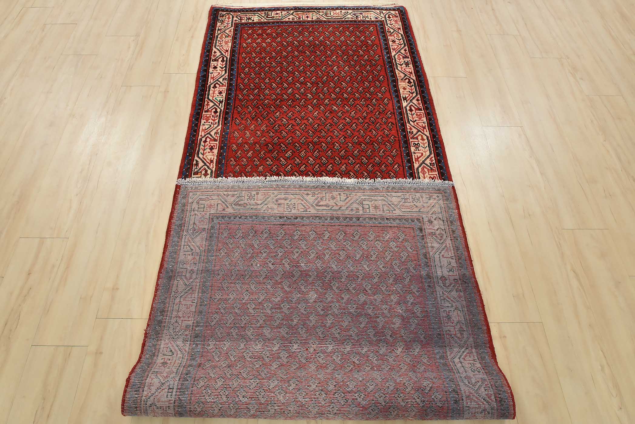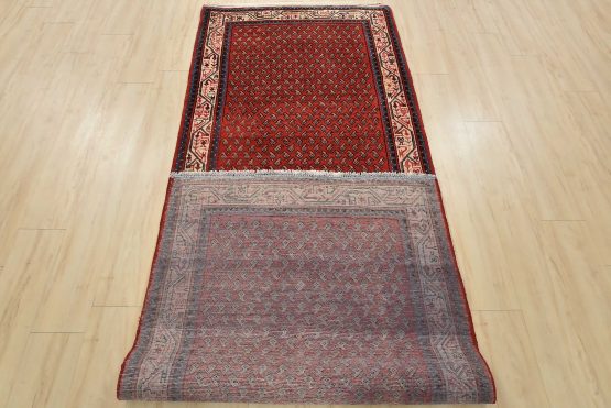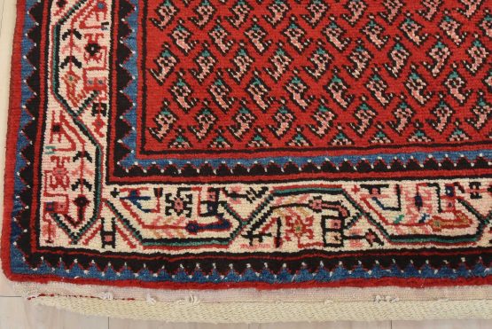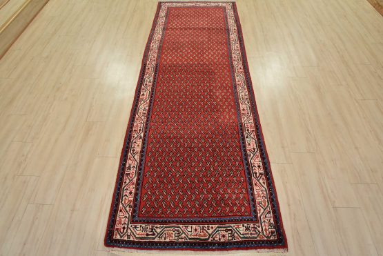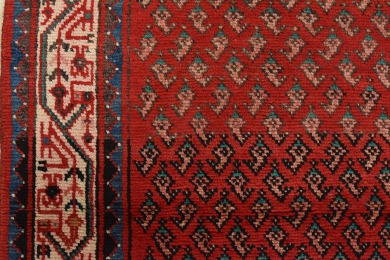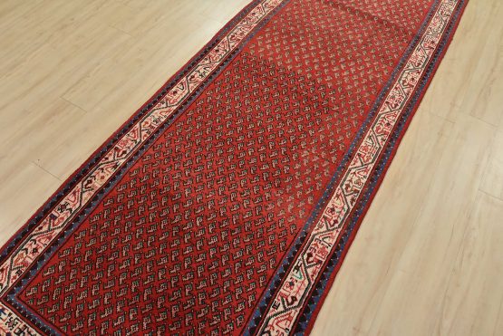 An authentic vintage tribal Mir runner hand-knotted with fine wool and natural dyes. This nomadic oriental rug features an all-over geometric Boteh design set against a red background. The wool pile shows some minor wear; please refer to the photos. Otherwise, the rug is in very good condition.