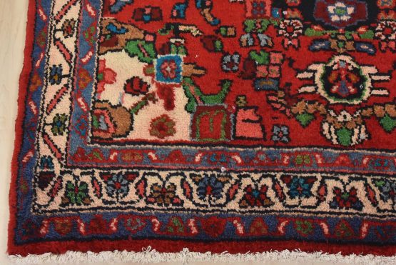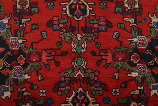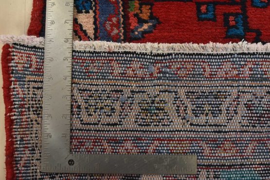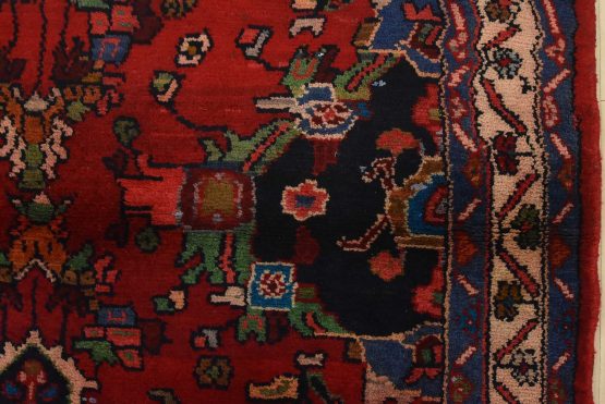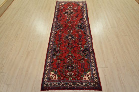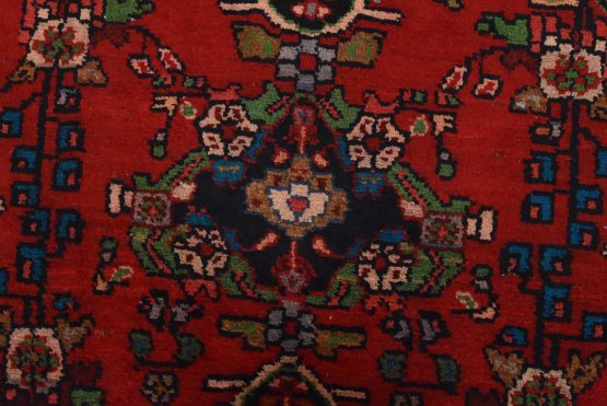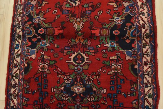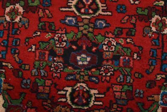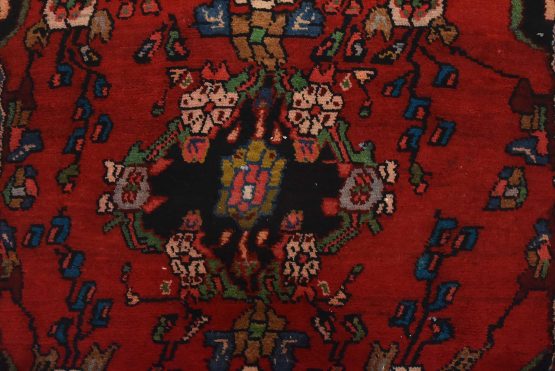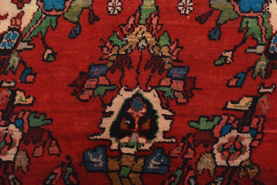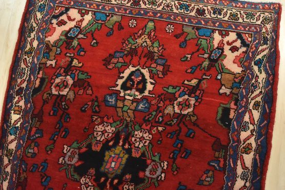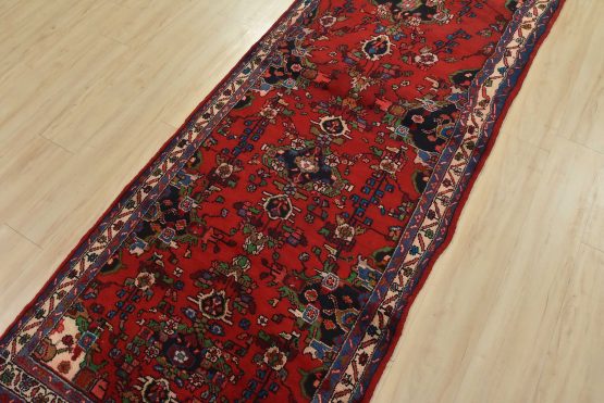 An authentic, vintage, traditional tribal Malayer runner hand-knotted with fine wool and natural dyes. This oriental rug features a row of small medallions surrounded by floral motifs set against a red background. The wool pile shows some minor wear; please refer to the photos. Otherwise, the rug is in very good condition.