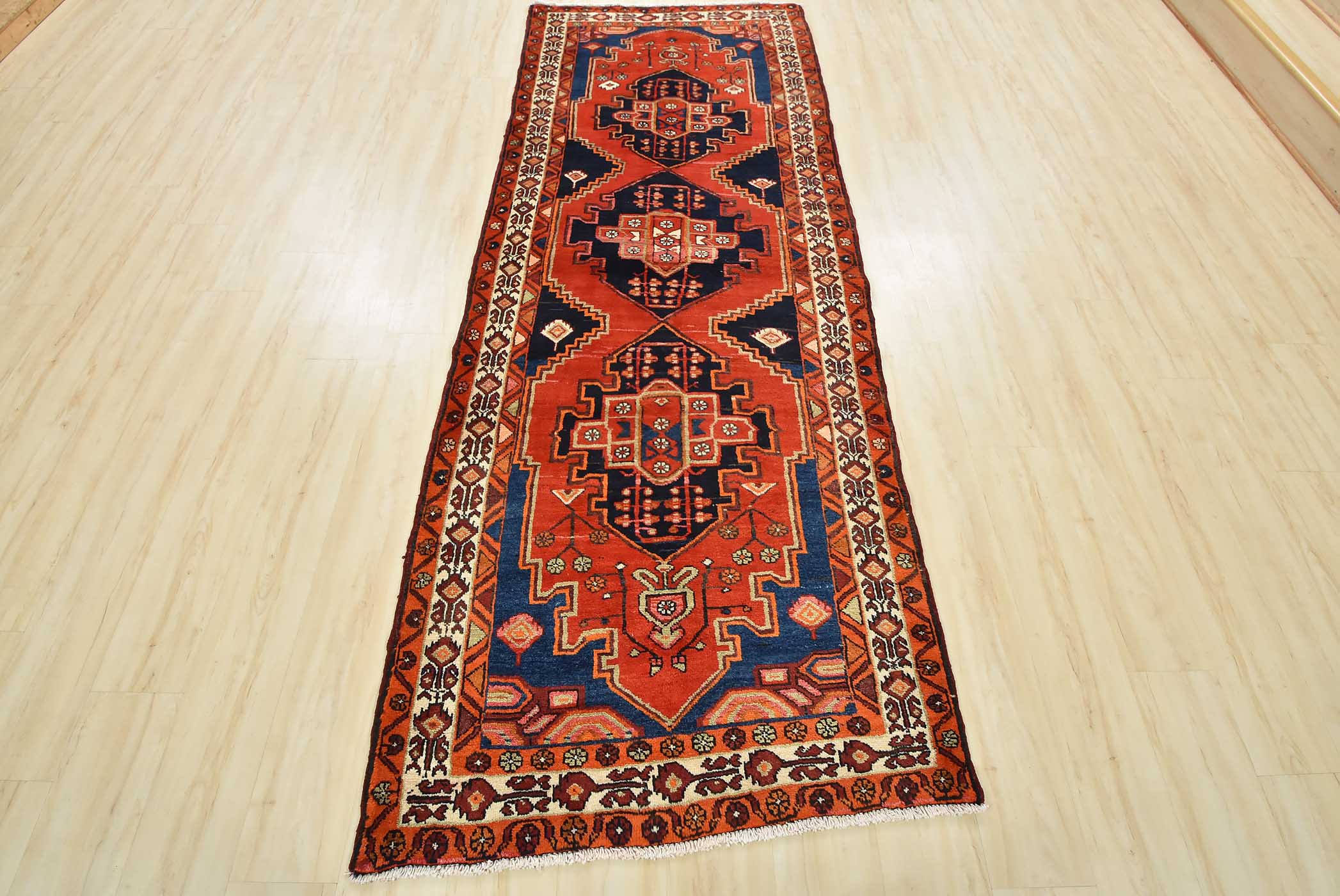 An authentic semi-antique tribal Sarab runner hand-knotted with fine wool and natural dyes. This nomadic oriental rug features geometric medallions set against a red background. The wool pile does show some minimal wear; please refer to the photos. Otherwise, this rug is in very good condition.