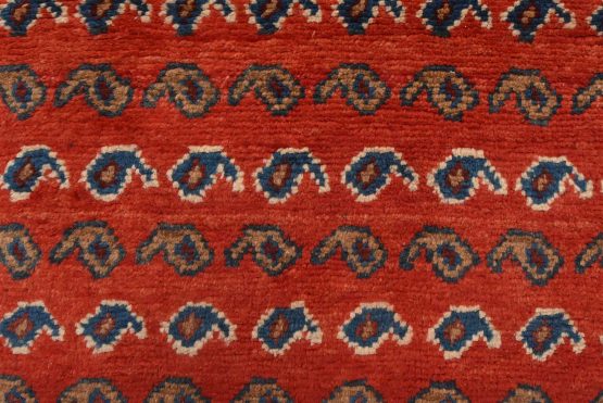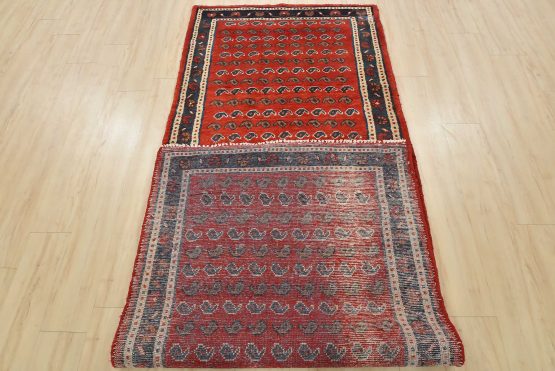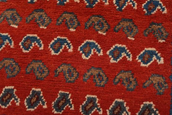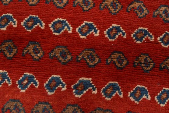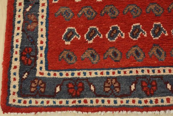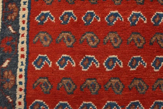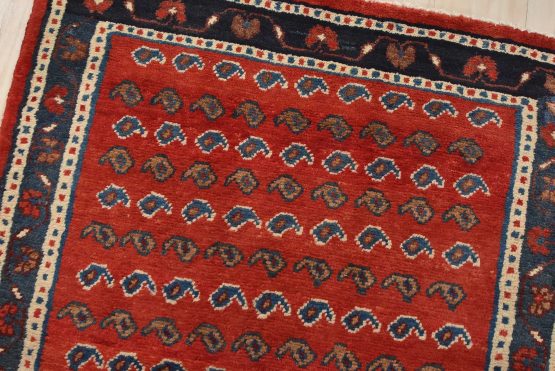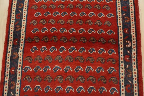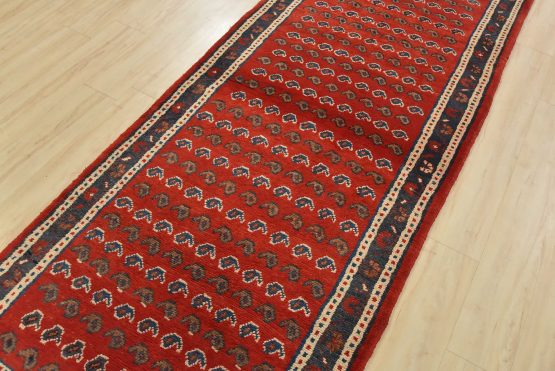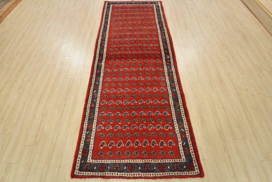 An authentic vintage tribal Mahal runner hand-knotted with fine wool and natural dyes. This oriental rug features an all-over geometric Boteh pattern set against a red background. It has a full wool pile with no worn areas and is in very good condition.