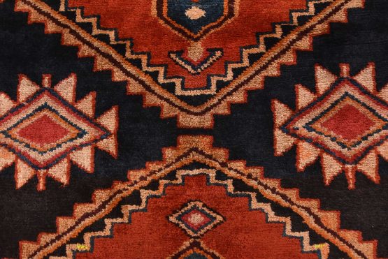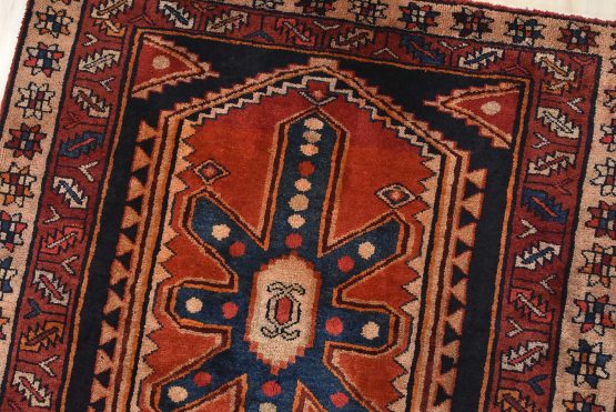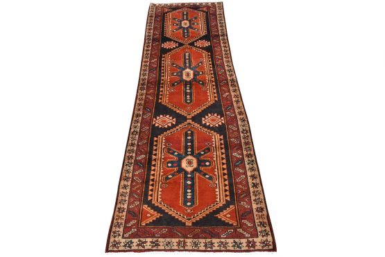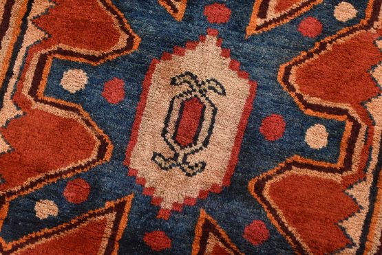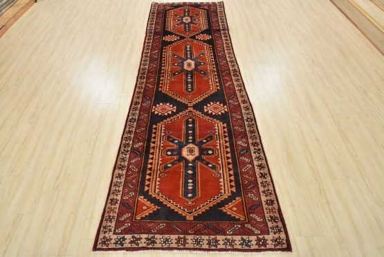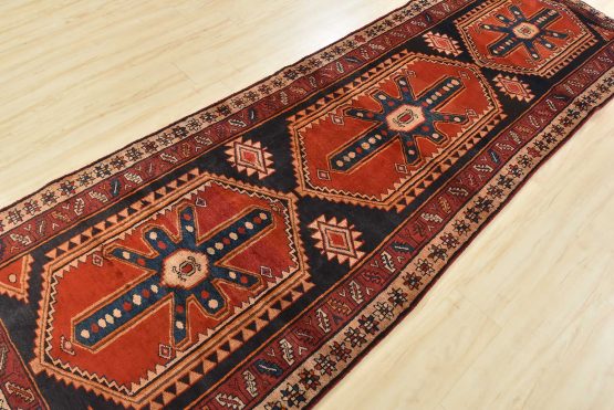 An authentic semi-antique tribal Sarab runner hand-knotted with fine wool and natural dyes. This nomadic oriental rug features geometric medallions surrounded by geometric motifs set against a dark blue background. The wool pile and fringe show some minor wear; please refer to the photos. Otherwise, this rug is in very good condition.