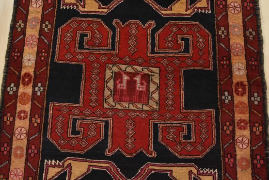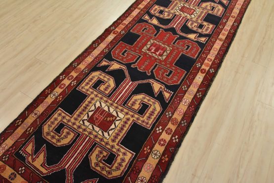 An authentic vintage tribal Ardabil runner hand-knotted with fine wool and natural dyes. This nomadic oriental rug features three geometric medallions with bird figures in the middle set against a dark blue background. It has a full wool pile with no worn areas and is in very good condition.