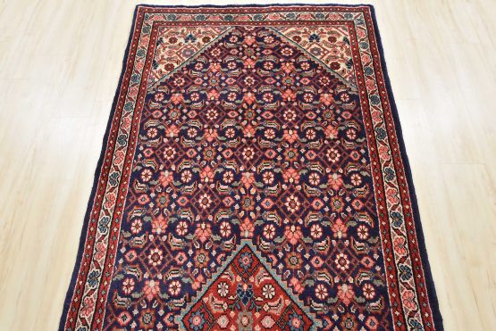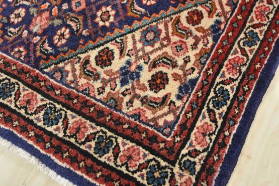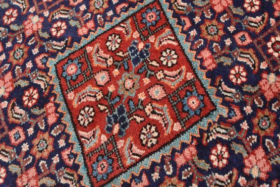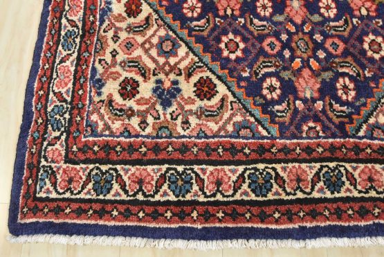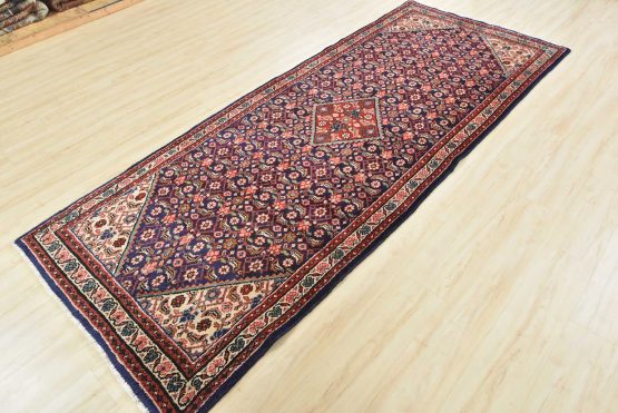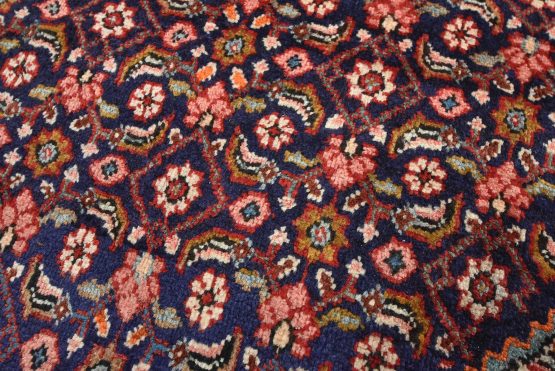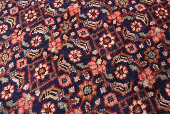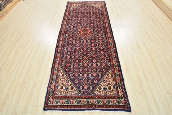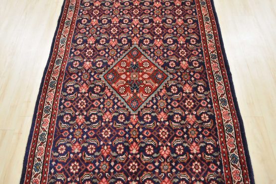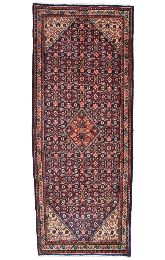 An authentic vintage tribal Hamedan runner hand-knotted with fine wool and natural dyes. This nomadic oriental rug features a geometric central medallion surrounded by a Herati pattern set against a dark blue background. The wool pile shows some minor wear; please refer to the photos. Otherwise, the rug is in very good condition.
