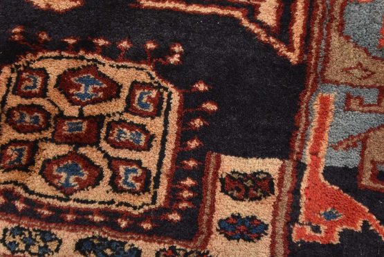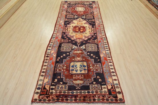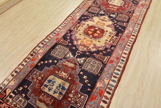An authentic semi-antique tribal Sarab runner hand-knotted with fine wool and natural dyes. This nomadic oriental rug features geometric medallions surrounded by geometric motifs set against a dark blue background. The wool pile shows some minimal wear; please refer to the photos. Otherwise, this rug is in very good condition.