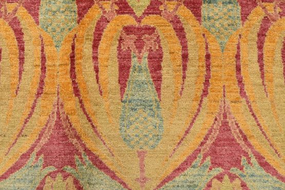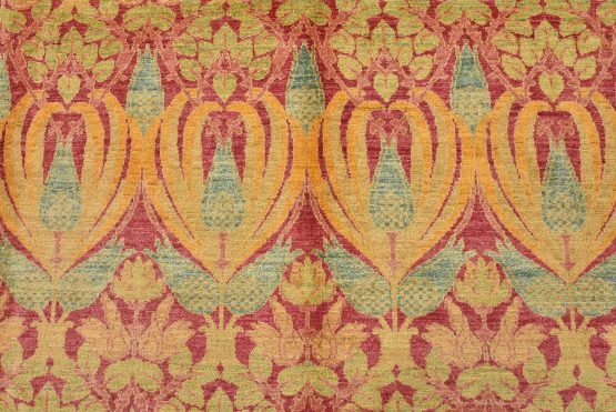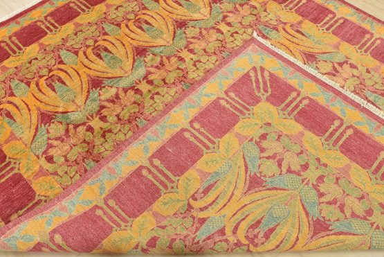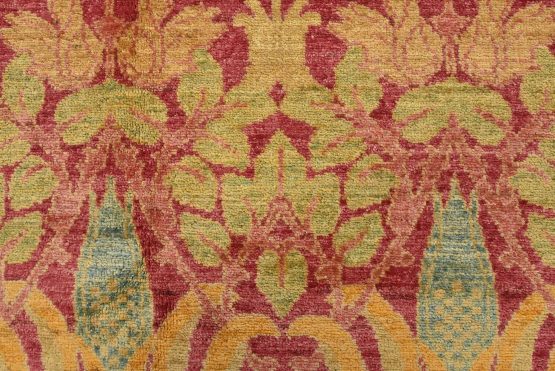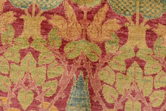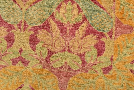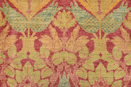 A modern traditional William Morris rug hand-knotted with an all-wool pile on a cotton foundation. This finely woven oriental rug features a curvilinear botanical pattern set against a pink background. It is new and in excellent condition.