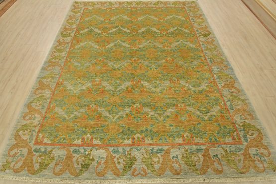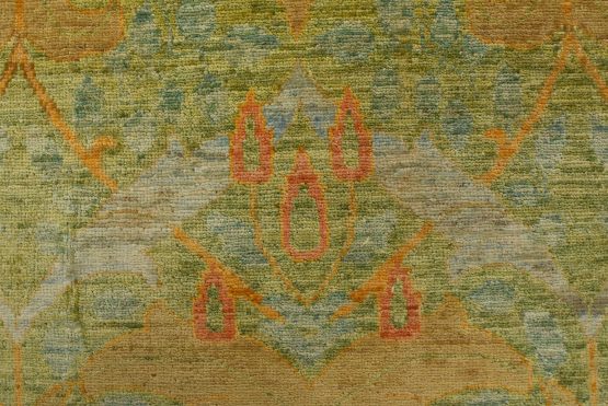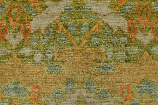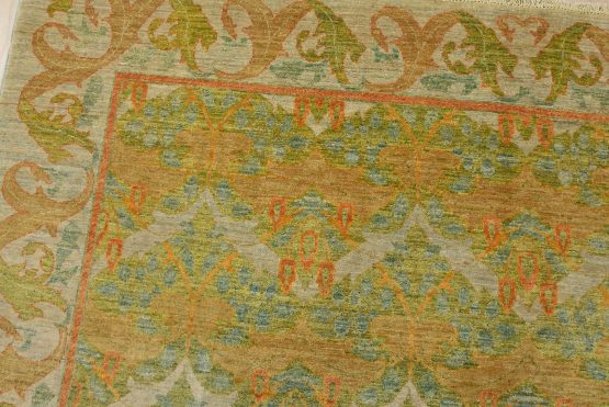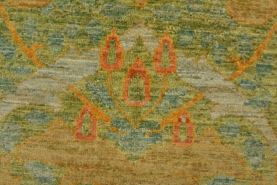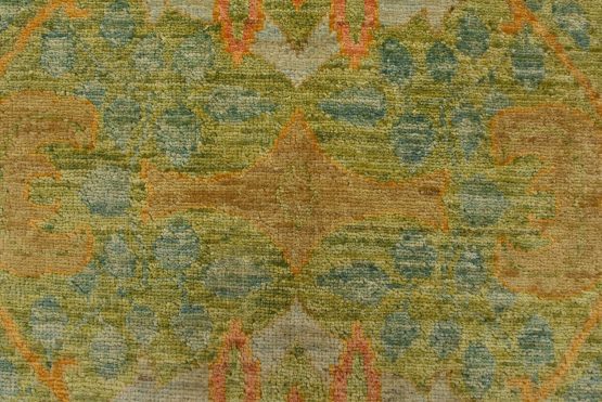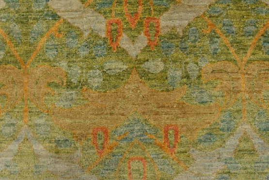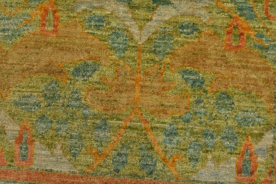 A traditional William Morris rug hand-knotted with an all-wool pile on a cotton foundation. This finely woven oriental rug features a subtle, all-over botanical design in green. It is new and in excellent condition.