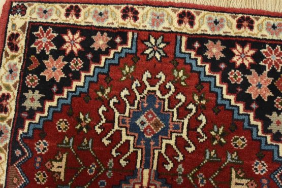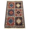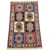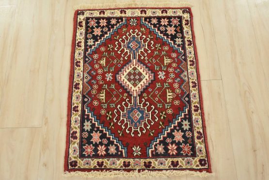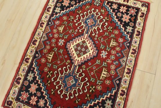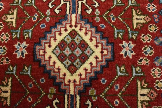 An authentic vintage tribal Yalameh rug hand-knotted with fine wool and natural dyes. This finely woven nomadic rug features geometric medallions surrounded by geometric motifs set against a red background. It has a full wool pile with no worn areas and is in very good condition.