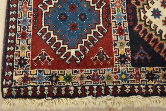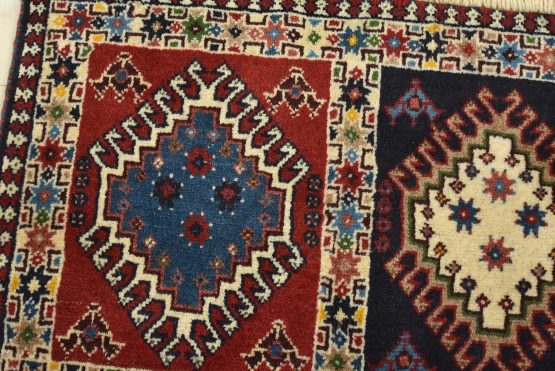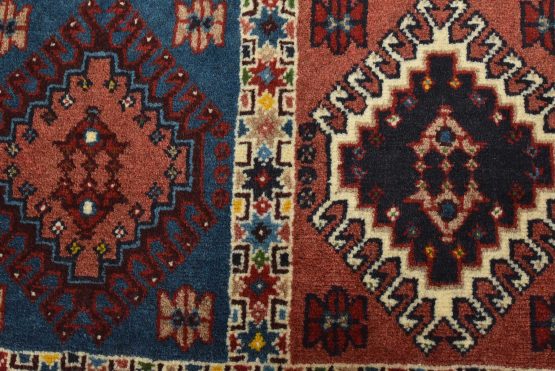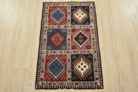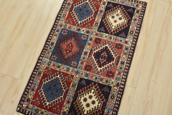 An authentic vintage tribal Yalameh rug hand-knotted with fine wool and natural dyes. This finely woven nomadic rug features a panel pattern composed of geometric motifs. It has a full wool pile with no worn areas and is in very good condition.