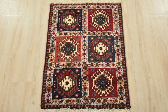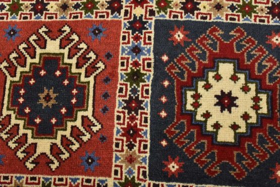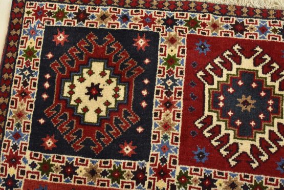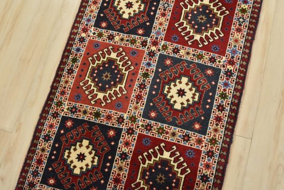 An authentic vintage tribal Yalameh rug hand-knotted with fine wool and natural dyes. This finely woven nomadic rug features a panel pattern composed of geometric motifs. It has a full wool pile with no worn areas and is in very good condition.