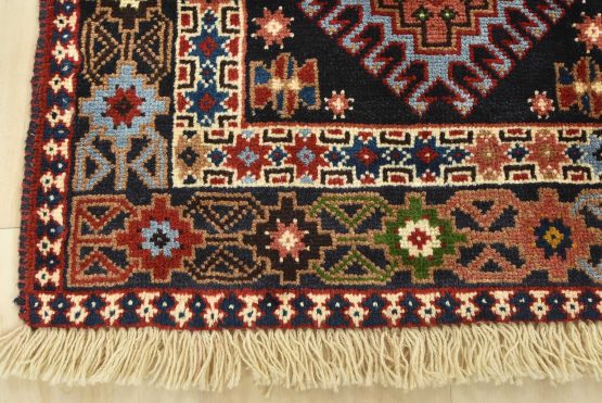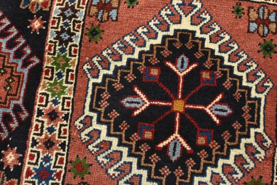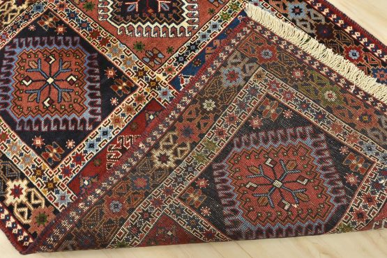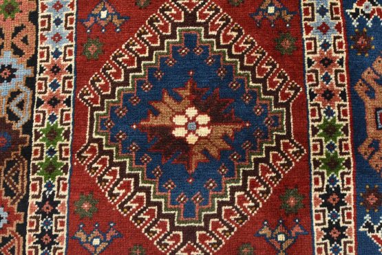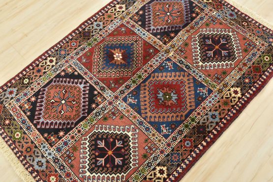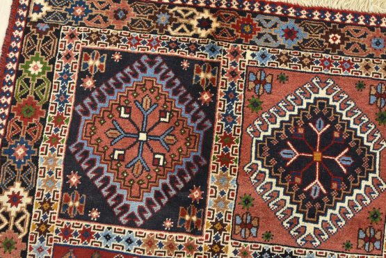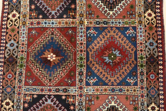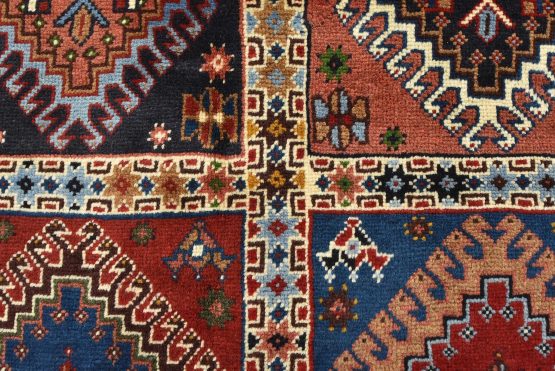 An authentic vintage tribal Yalameh rug hand-knotted with fine wool and natural dyes. This finely woven nomadic rug features a panel design composed of geometric motifs. It has a full wool pile with no worn areas and is in very good condition.