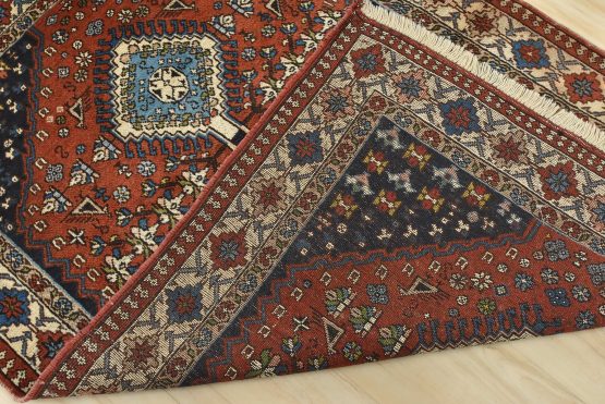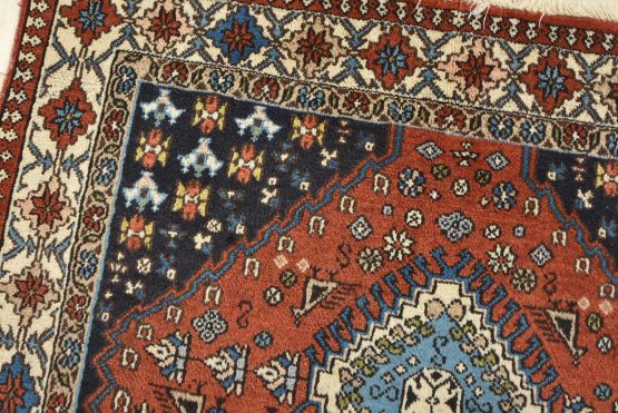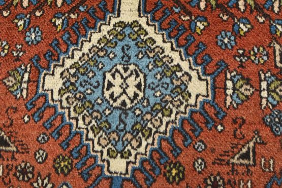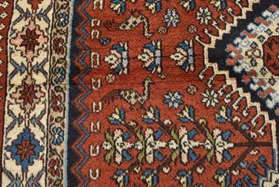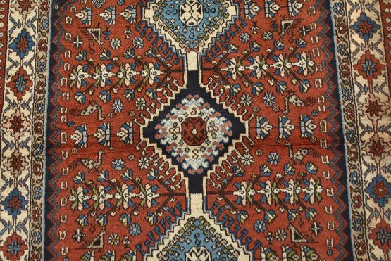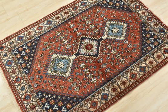 An authentic vintage tribal Yalameh rug hand-knotted with fine wool and natural dyes. This finely woven nomadic rug features geometric medallions with bird figures set against a red background. The color dyes have bled through the ivory border in one area. Some corners have a loose edge, and the wool pile shows minor wear (see photos). Overall, this rug is in very good condition.