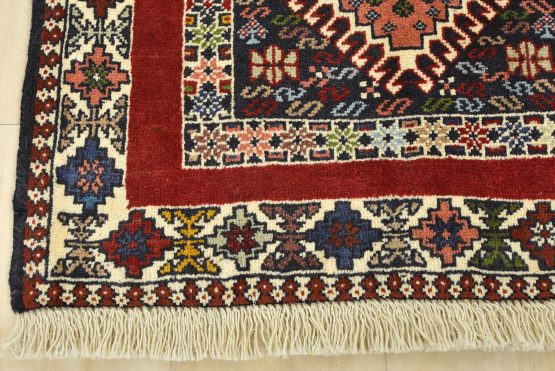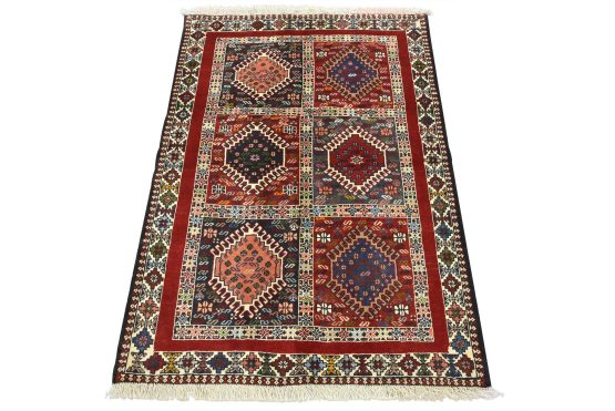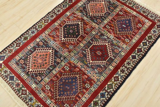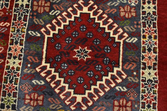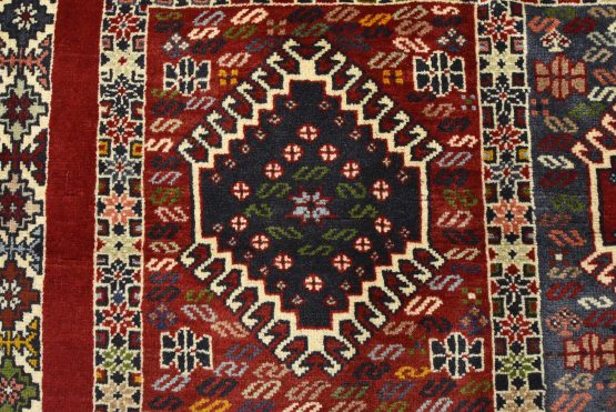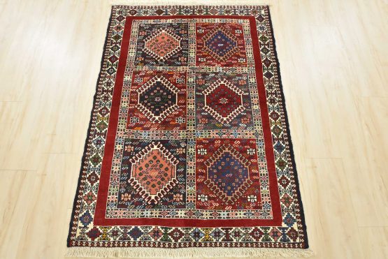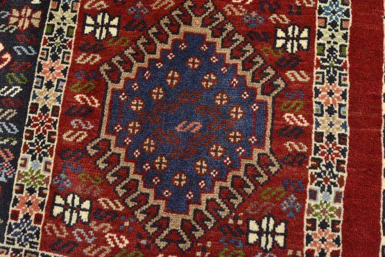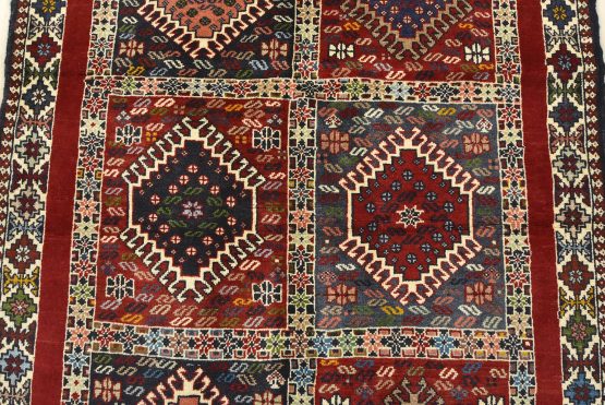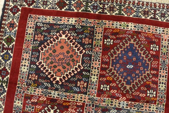An authentic vintage tribal Yalameh rug hand-knotted with fine wool and natural dyes. This finely woven nomadic rug features a panel design composed of geometric motifs. It has a full wool pile with no worn areas and is in very good condition.