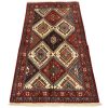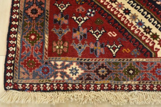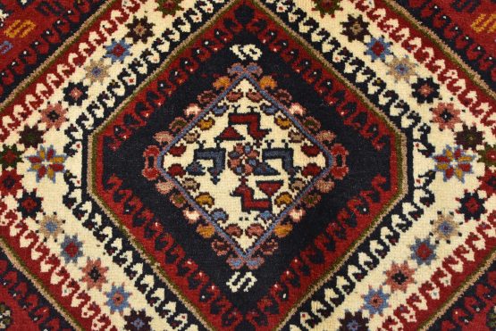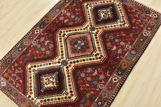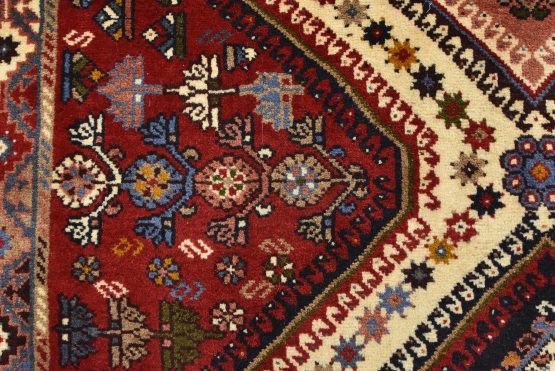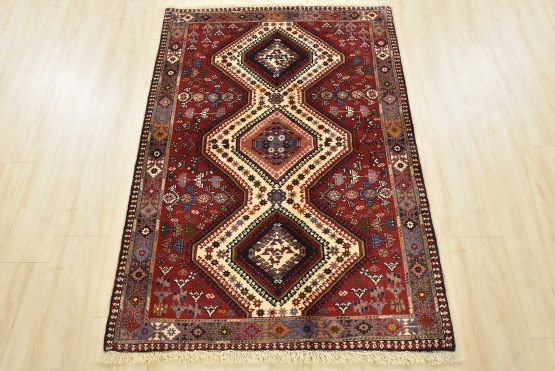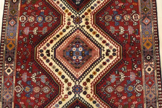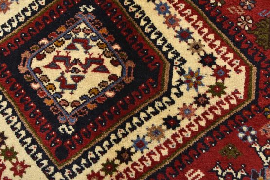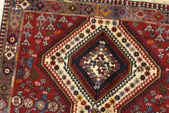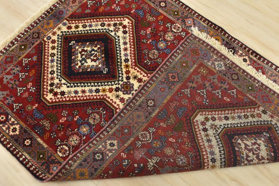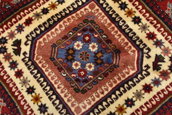 An authentic vintage tribal Yalameh rug hand-knotted with fine wool and natural dyes. This finely woven nomadic rug features geometric medallions surrounded by small geometric motifs set against a red background. It has a full wool pile with no worn areas and is in very good condition.