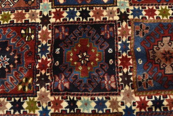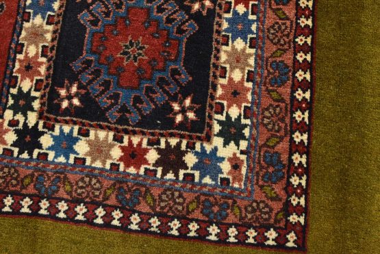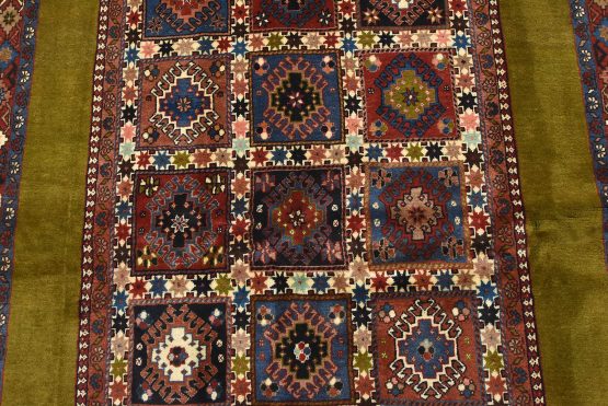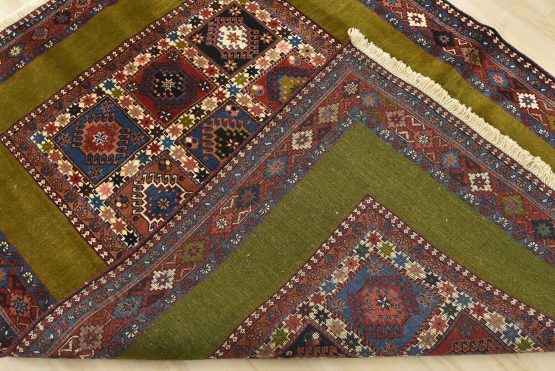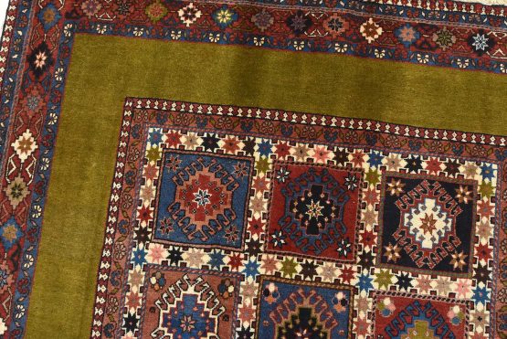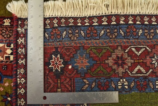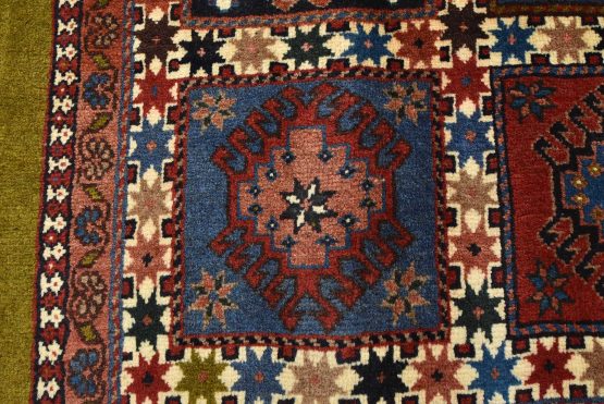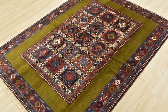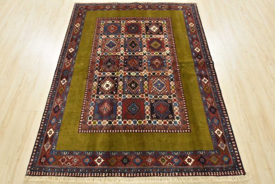 An authentic vintage tribal Yalameh rug hand-knotted with fine wool and natural dyes. This finely woven nomadic rug features a panel pattern of geometric motifs set against a green background. It has a full wool pile with no worn areas and is in very good condition.