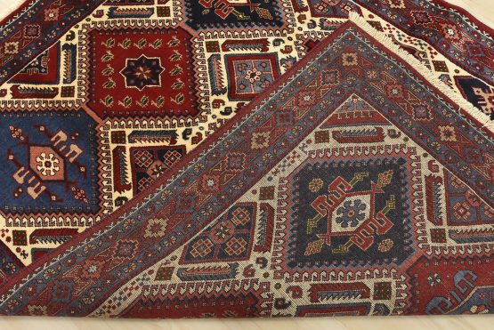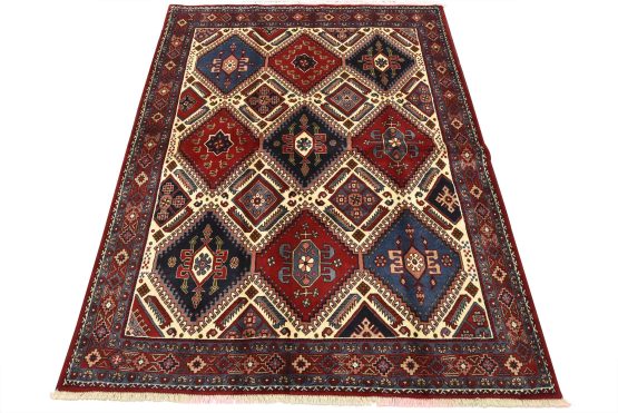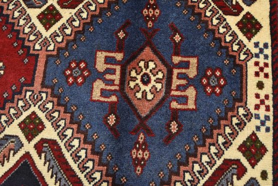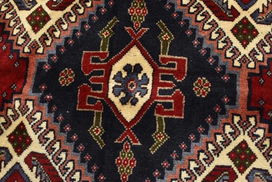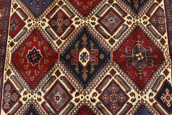 An authentic vintage tribal Yalameh rug hand-knotted with fine wool and natural dyes. This finely woven nomadic rug features geometric medallions surrounded by geometric motifs set against an ivory background. It has a full wool pile with no worn areas and is in very good condition.