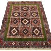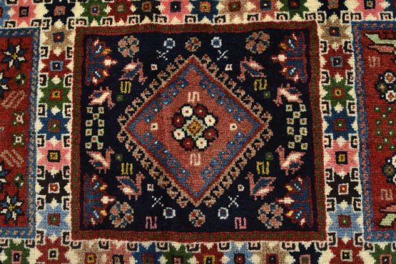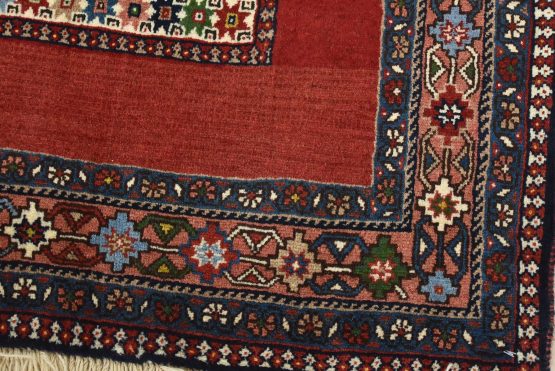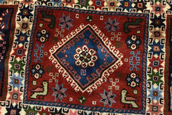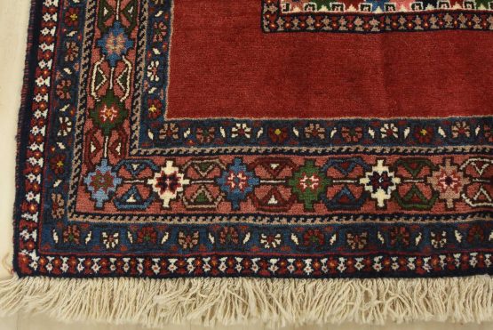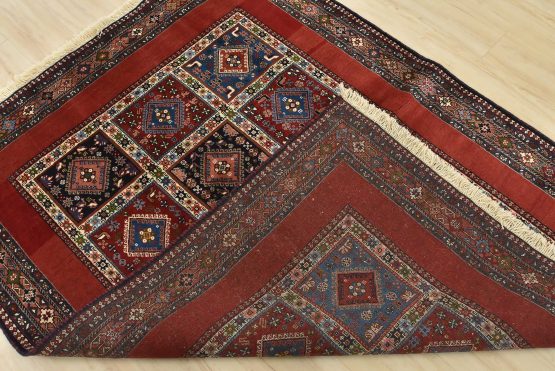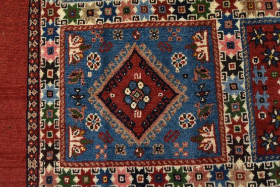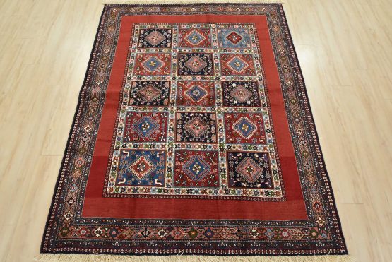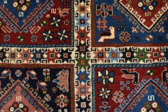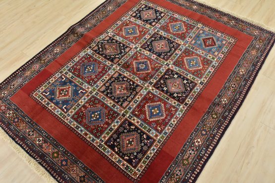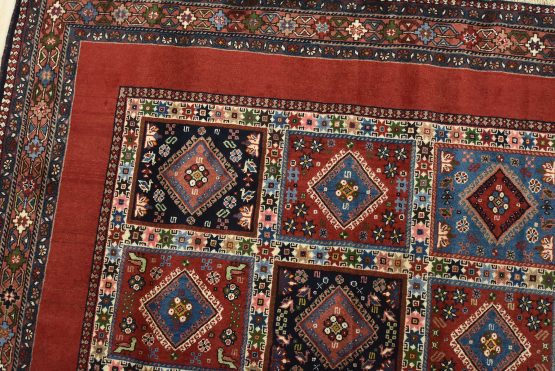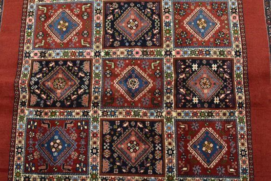 An authentic vintage tribal Yalameh rug hand-knotted with fine wool and natural dyes. This finely woven nomadic rug features a panel design with geometric motifs set against a red background. It has a full wool pile with no worn areas and is in very good condition.