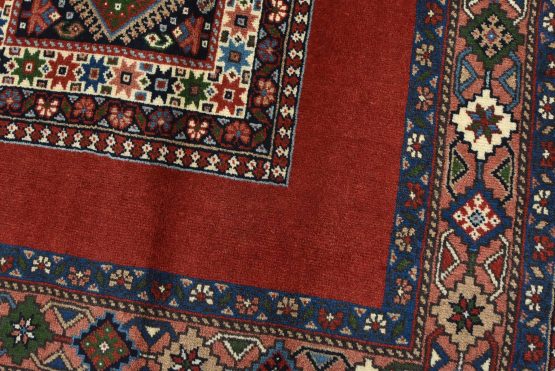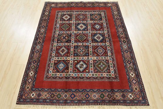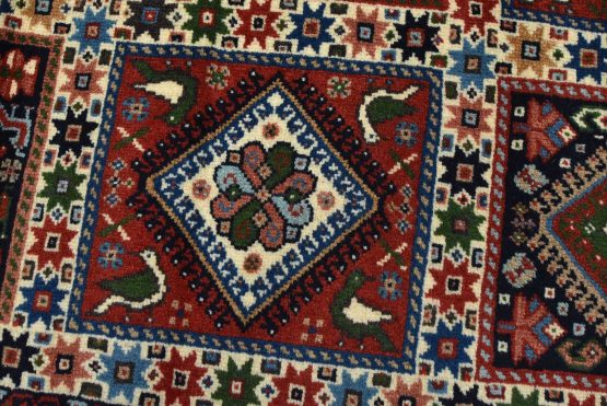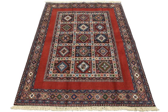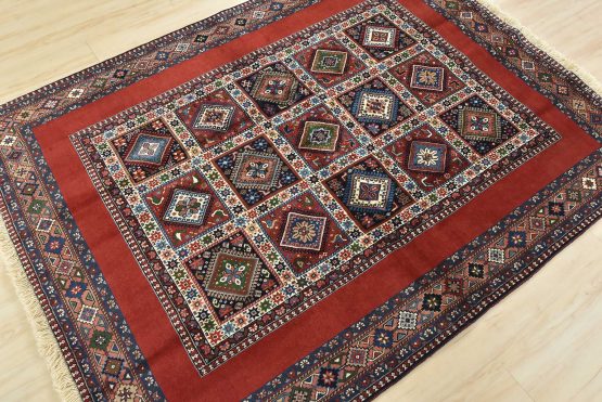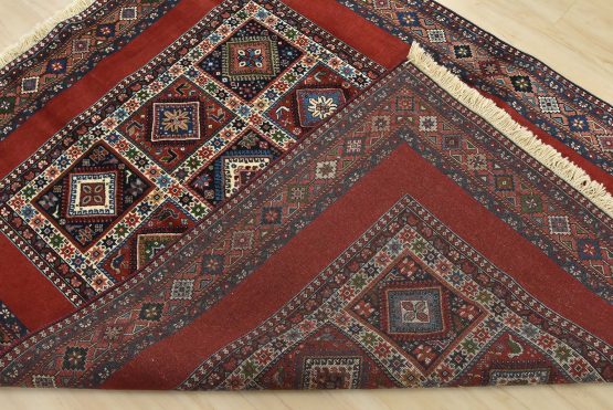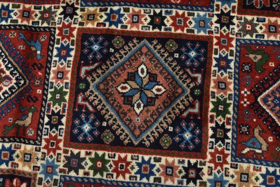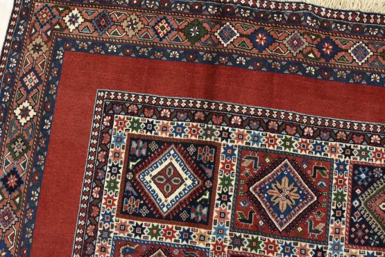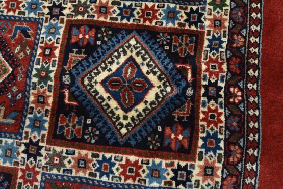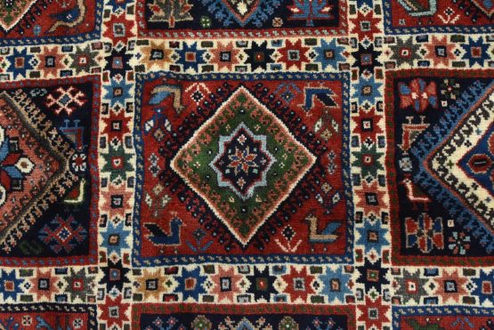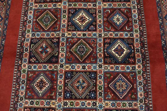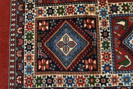 An authentic vintage tribal Yalameh rug hand-knotted with fine wool and natural dyes. This finely woven nomadic rug features a panel design of geometric motifs set against a red background. It has a full wool pile with no worn areas and is in very good condition.