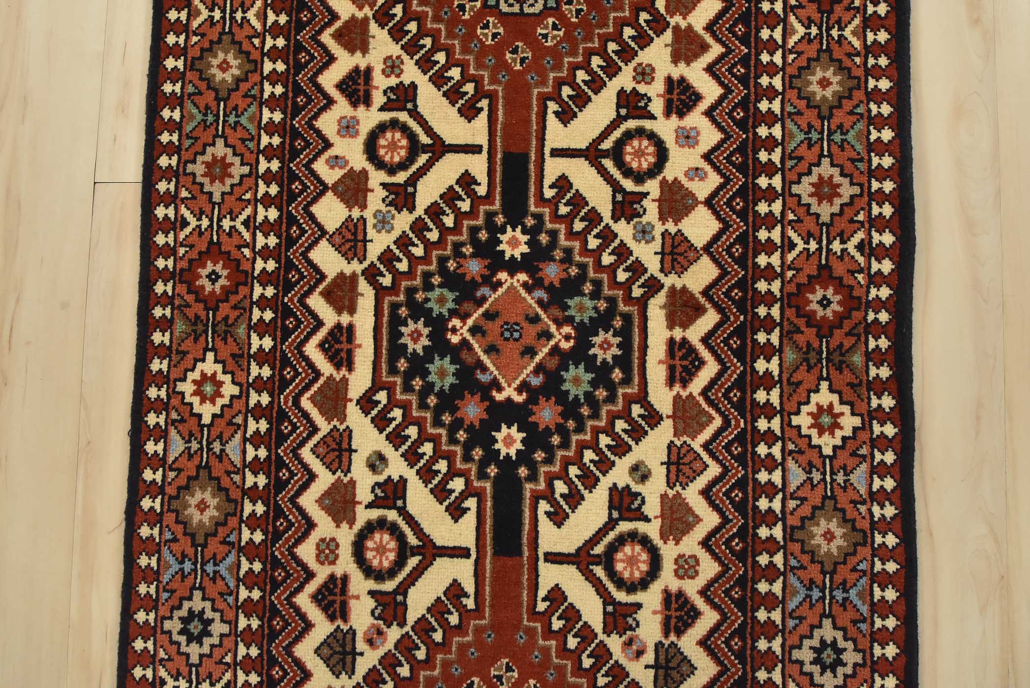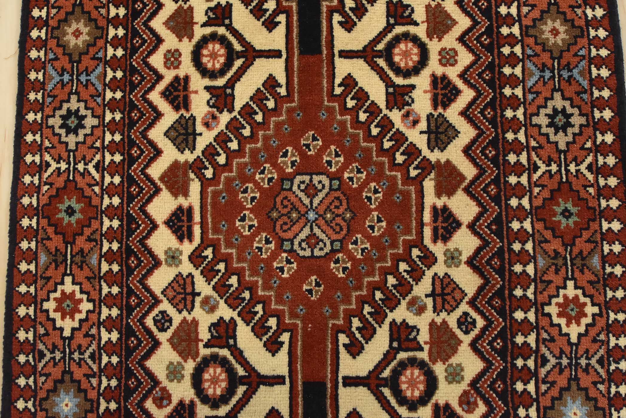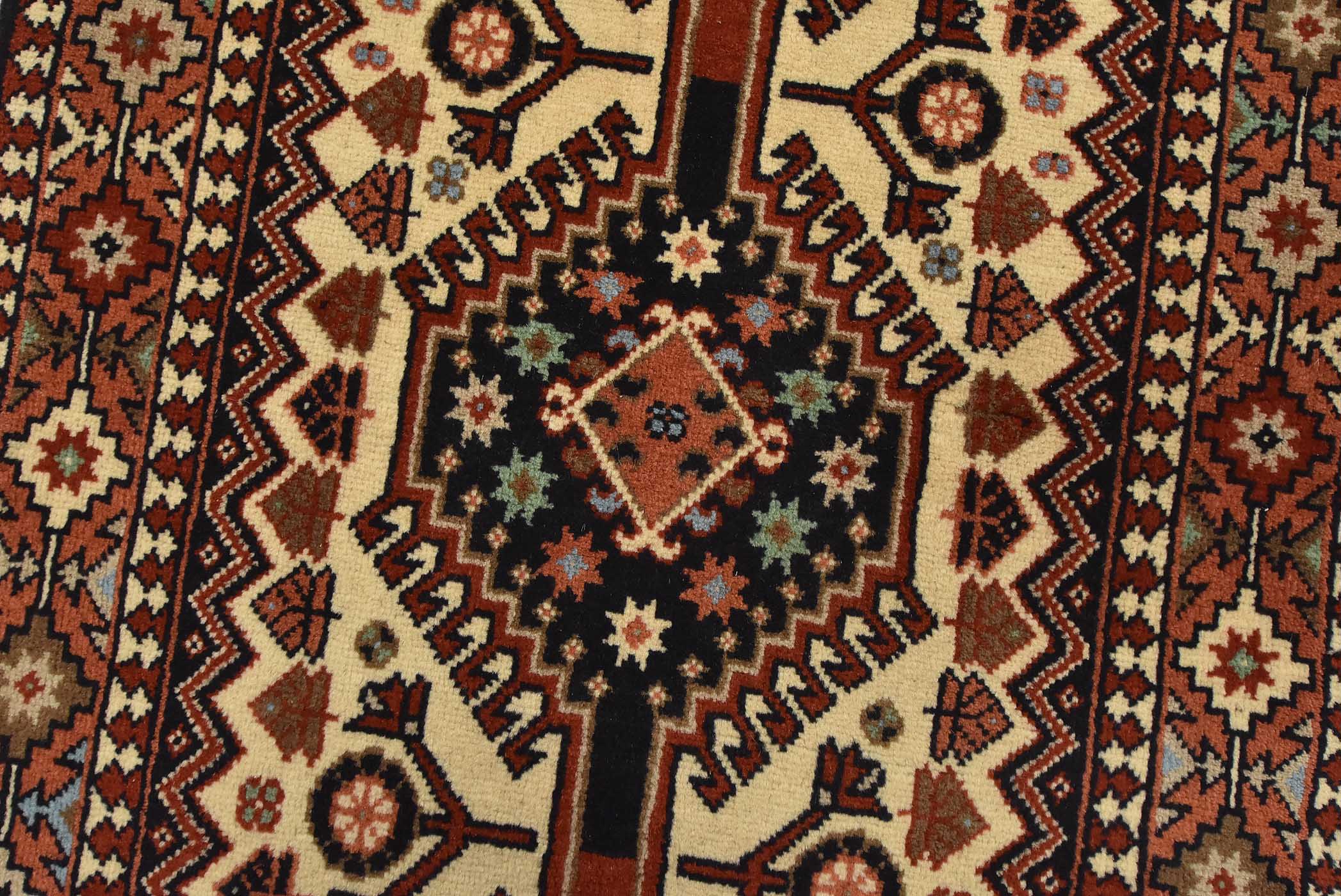 An authentic vintage tribal Yalameh runner hand-knotted with fine wool and natural dyes. This intricately woven rug features a row of geometric medallions surrounded by geometric motifs set against an ivory background. It has a full wool pile with no worn areas and is in very good condition.