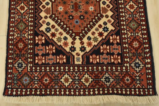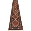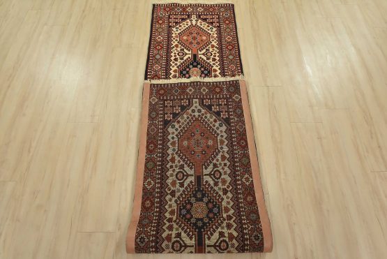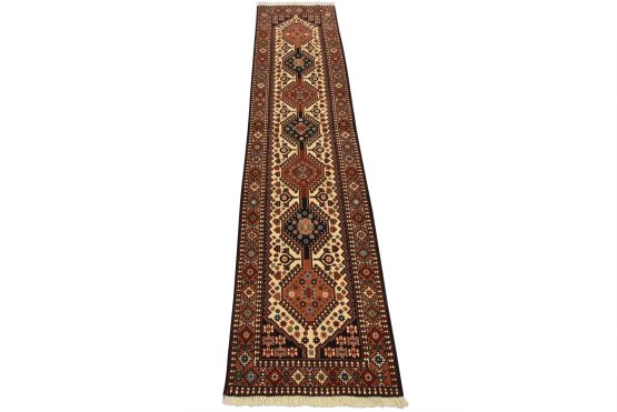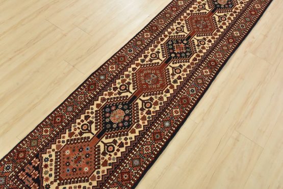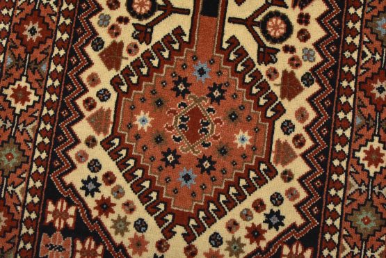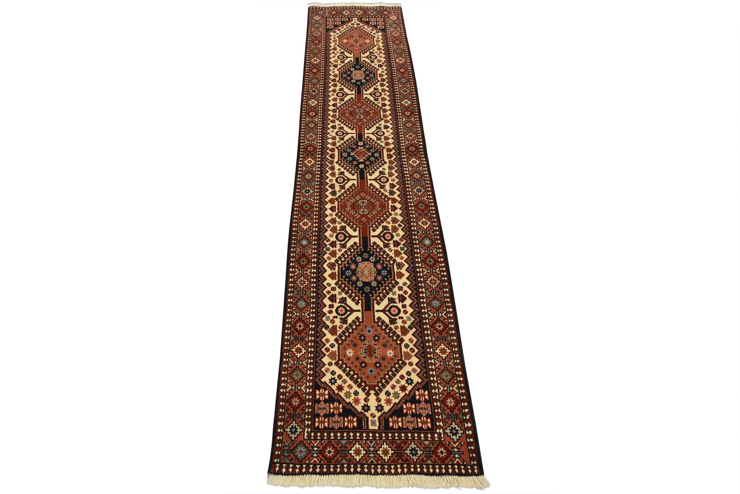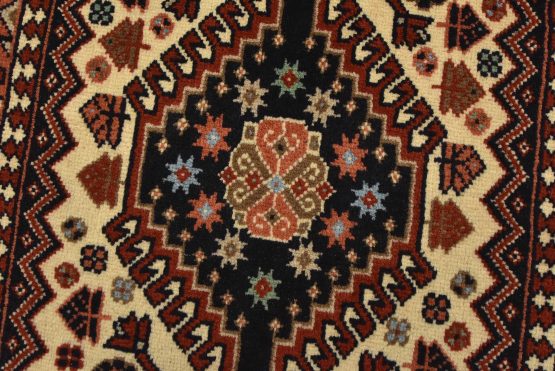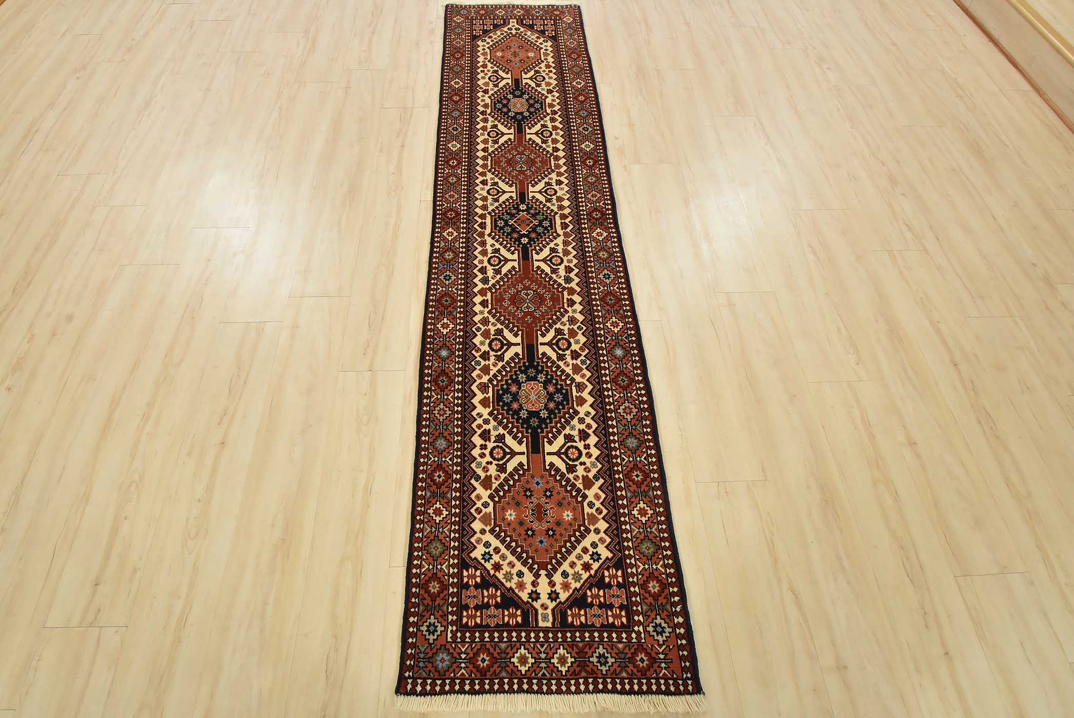 An authentic vintage tribal Yalameh runner hand-knotted with fine wool and natural dyes. This intricately woven rug features a row of geometric medallions surrounded by geometric motifs set against an ivory background. It has a full wool pile with no worn areas and is in very good condition.