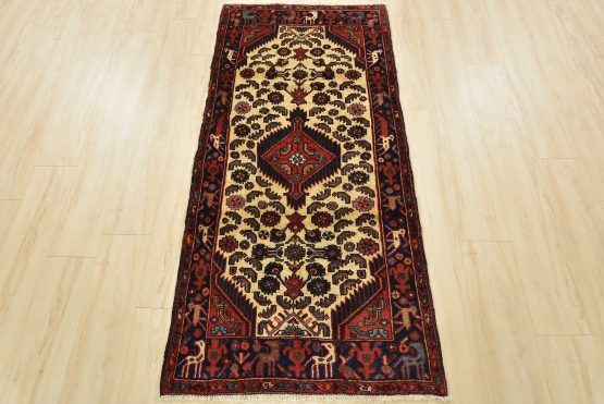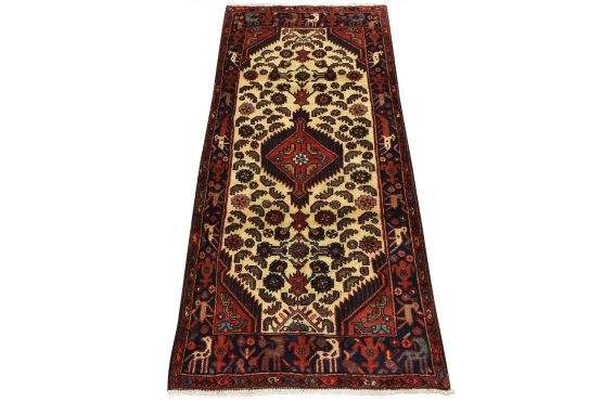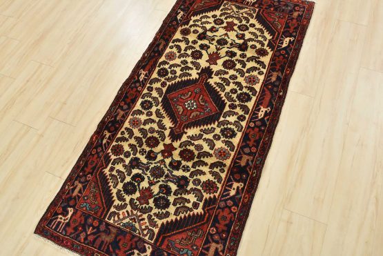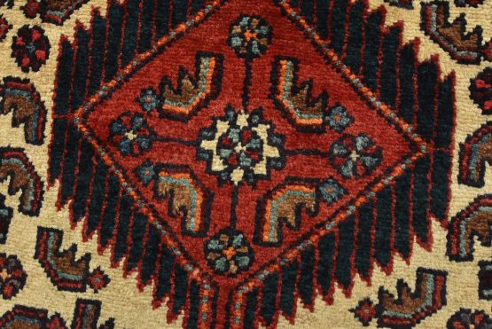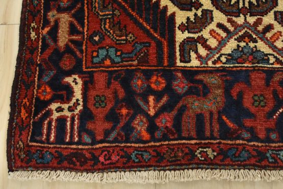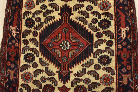 An authentic vintage tribal Zanjan rug hand-knotted with fine wool and natural dyes. This nomadic oriental rug features a central geometric medallion surrounded by small geometric motifs set against an ivory background with animal figures embedded in the border. It has a full wool pile with no worn areas and is in very good condition.