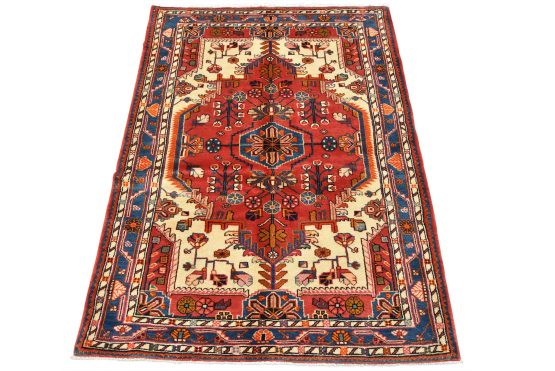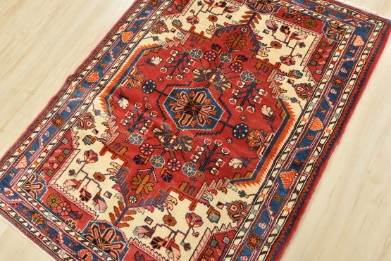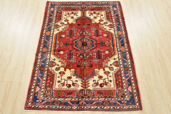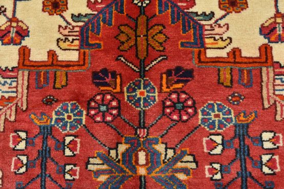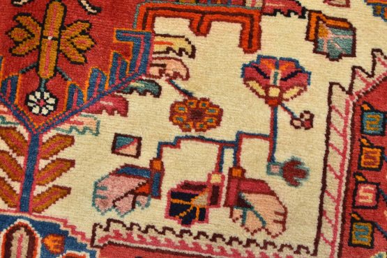 An authentic vintage tribal Zanjan rug hand-knotted with fine wool and natural dyes. This nomadic oriental rug features a central geometric medallion surrounded by geometric botanical motifs set against an ivory background. It has a full wool pile with no worn areas and is in very good condition.