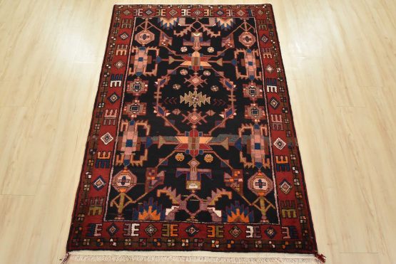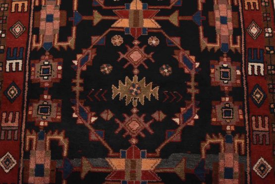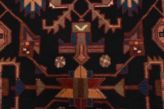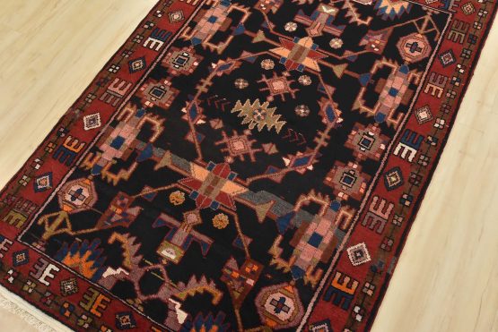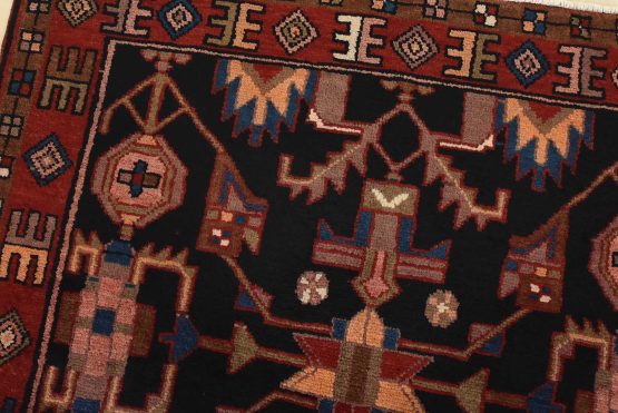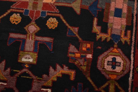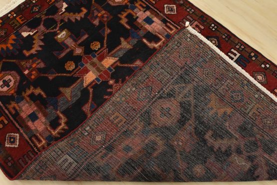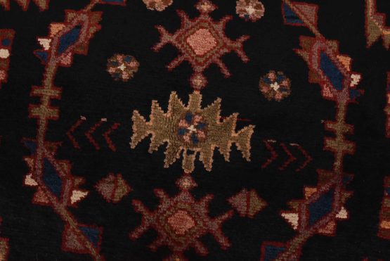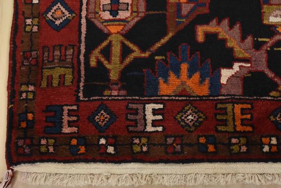 An authentic vintage tribal Zanjan rug hand-knotted with fine wool and natural dyes. This nomadic oriental rug features a geometric botanical design set against a dark blue background. It has a full wool pile with no worn areas and is in very good condition.