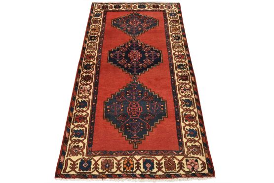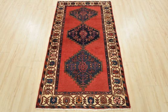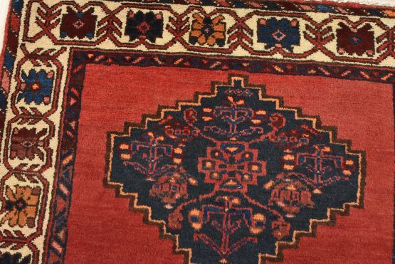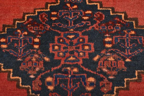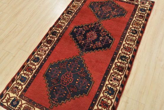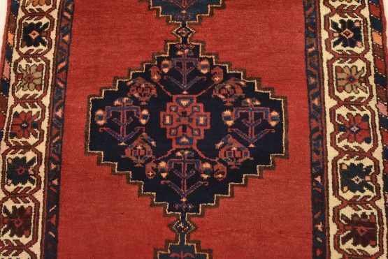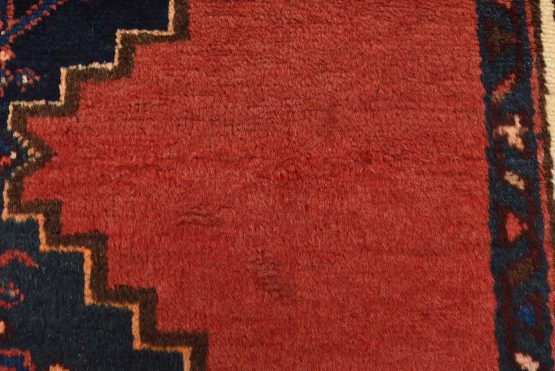 An authentic vintage tribal Zanjan rug hand-knotted with fine wool and natural dyes. This nomadic oriental rug features three geometric medallions set against a red background. The wool pile does show some minor wear; please refer to the photos. Otherwise, this rug is in very good condition.