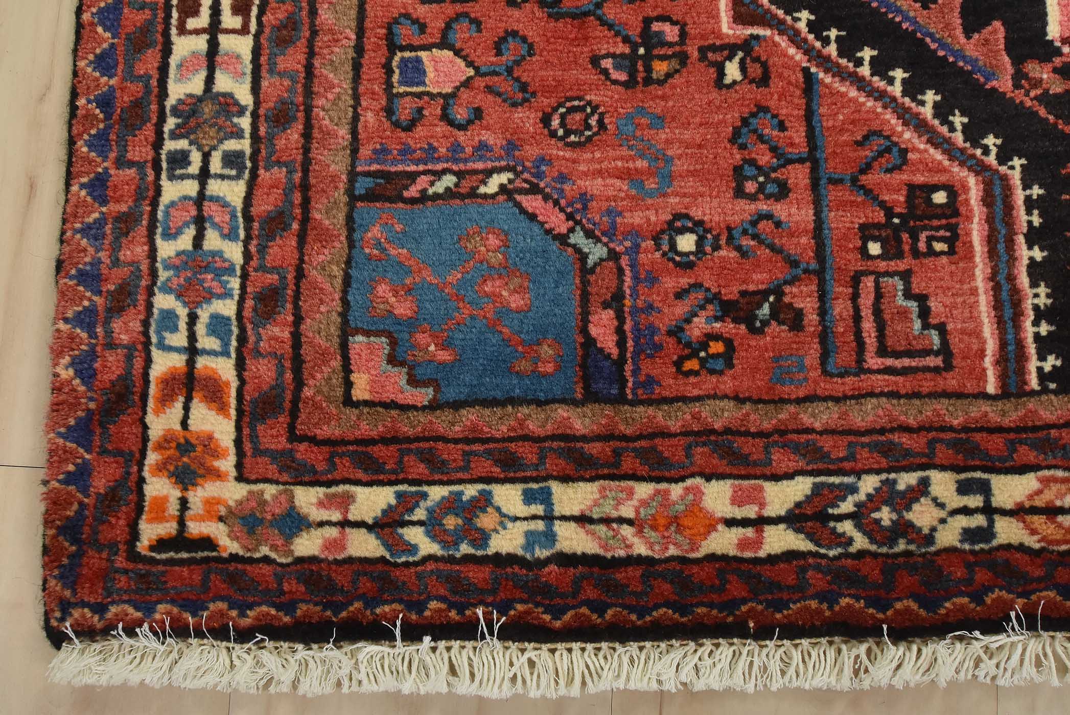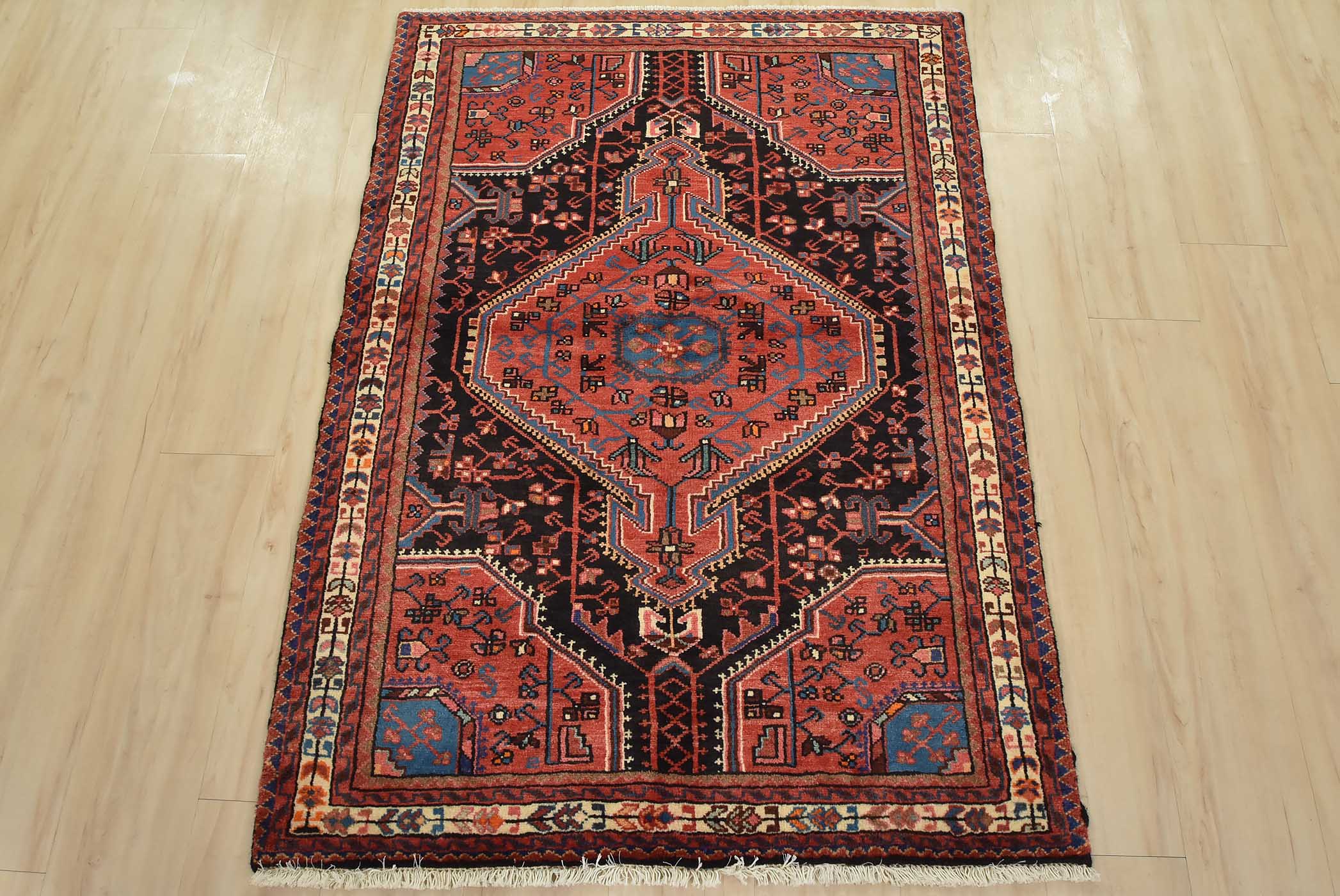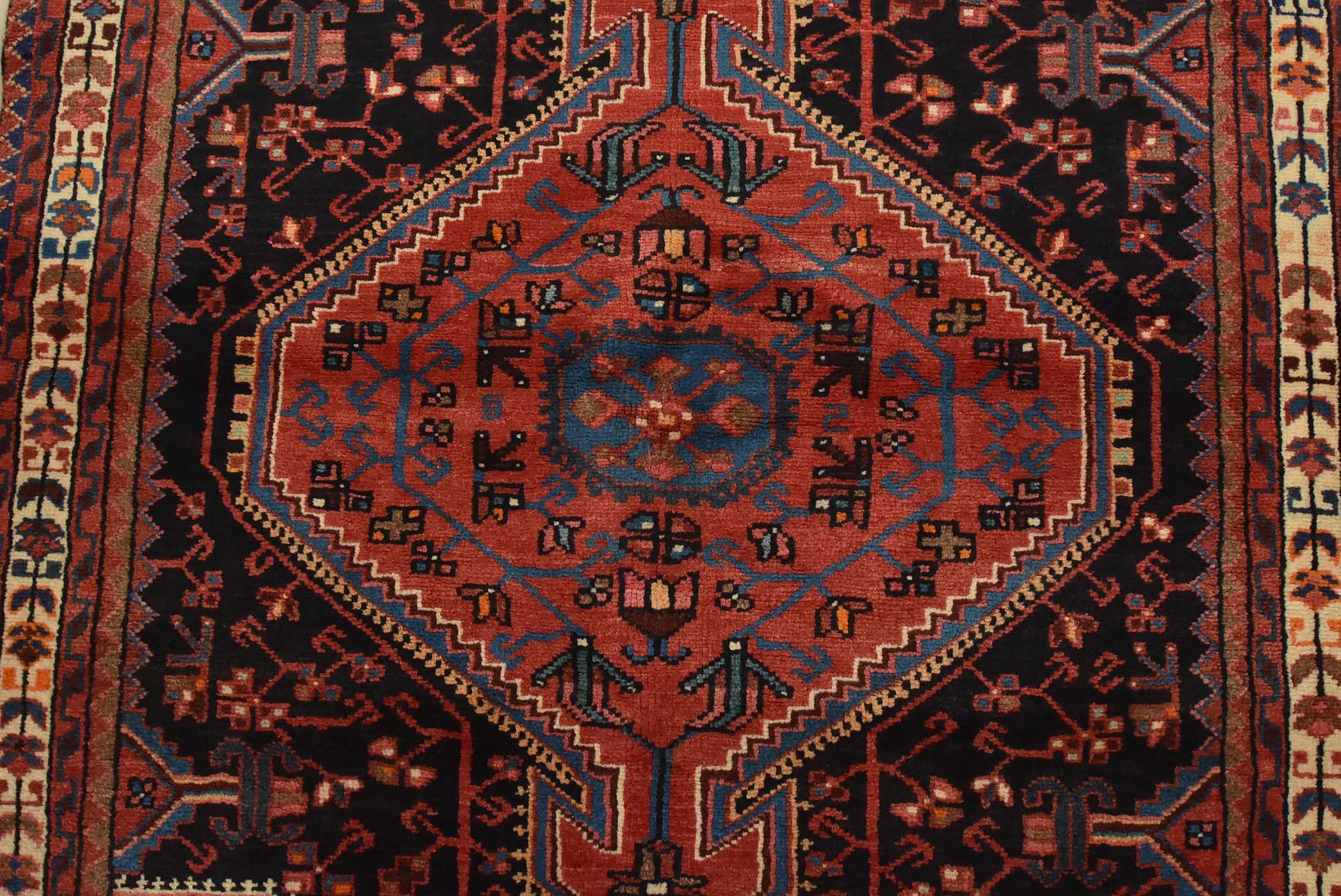 An authentic vintage tribal Zanjan rug hand-knotted with fine wool and natural dyes. This nomadic rug features a central geometric medallion surrounded by a geometric botanical design set against a blue background. It has a full wool pile with no worn areas and is in very good condition.
