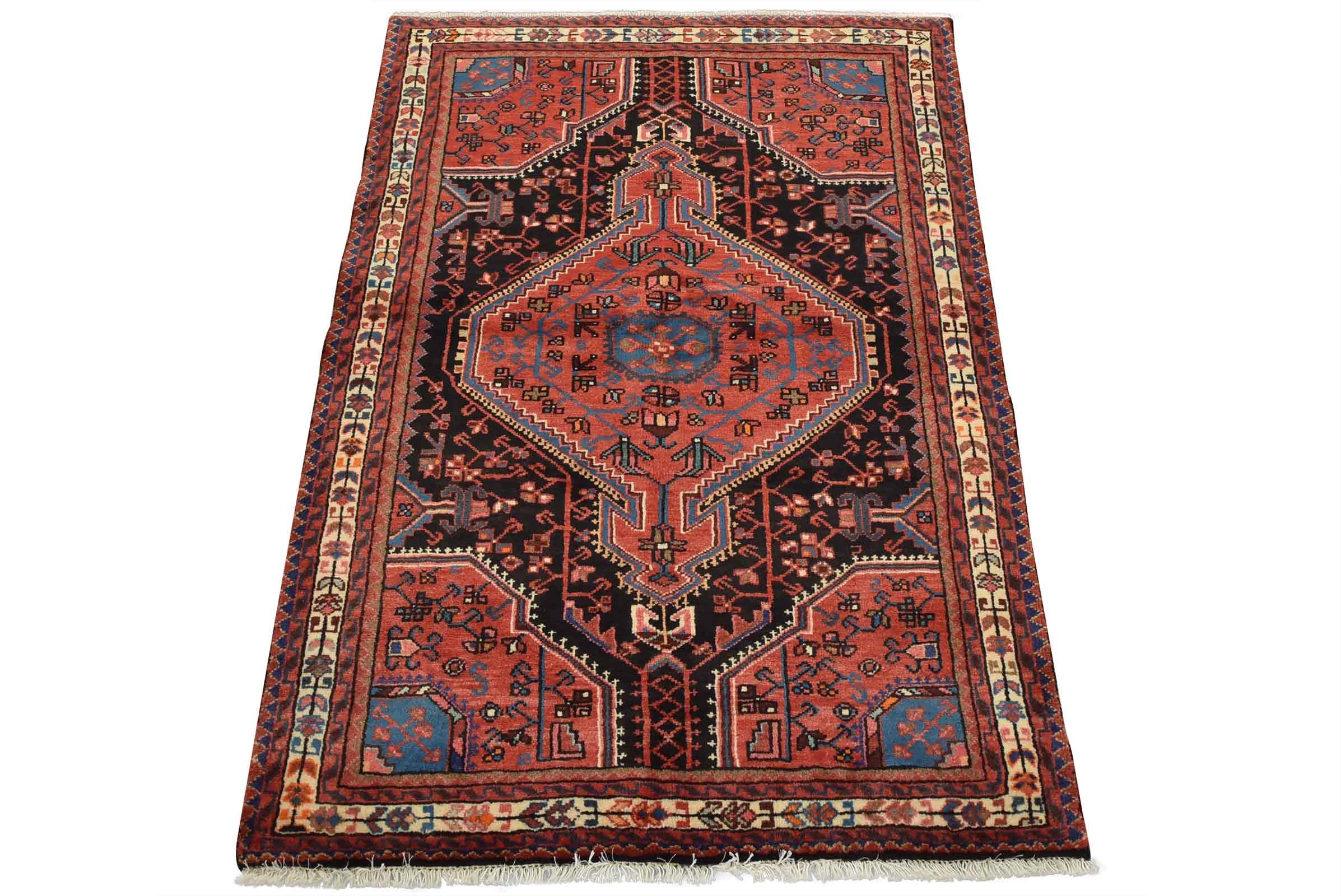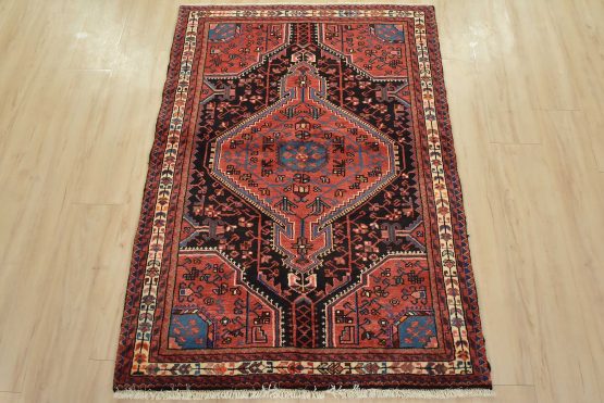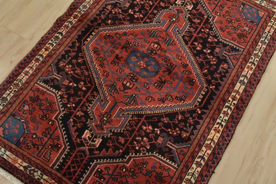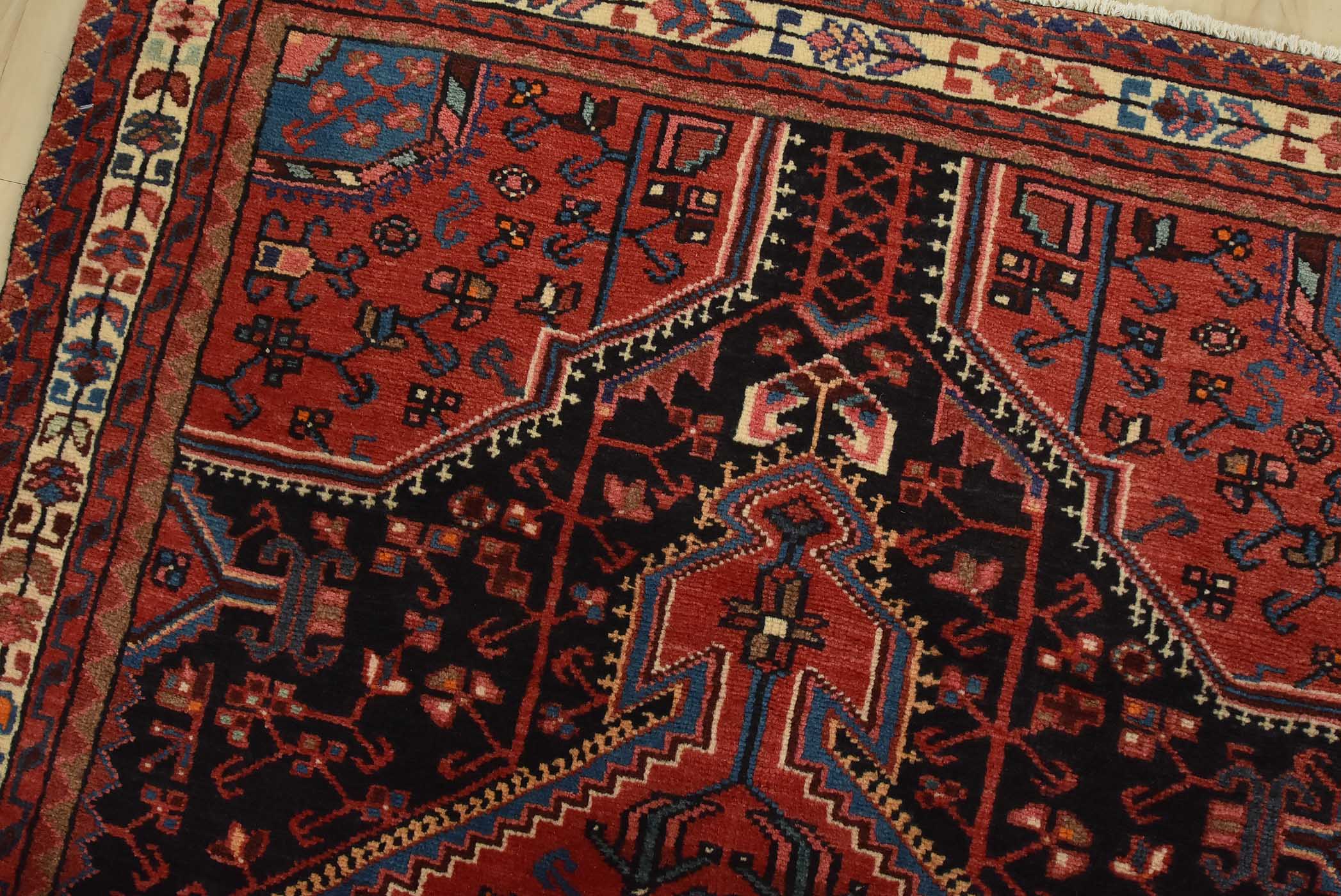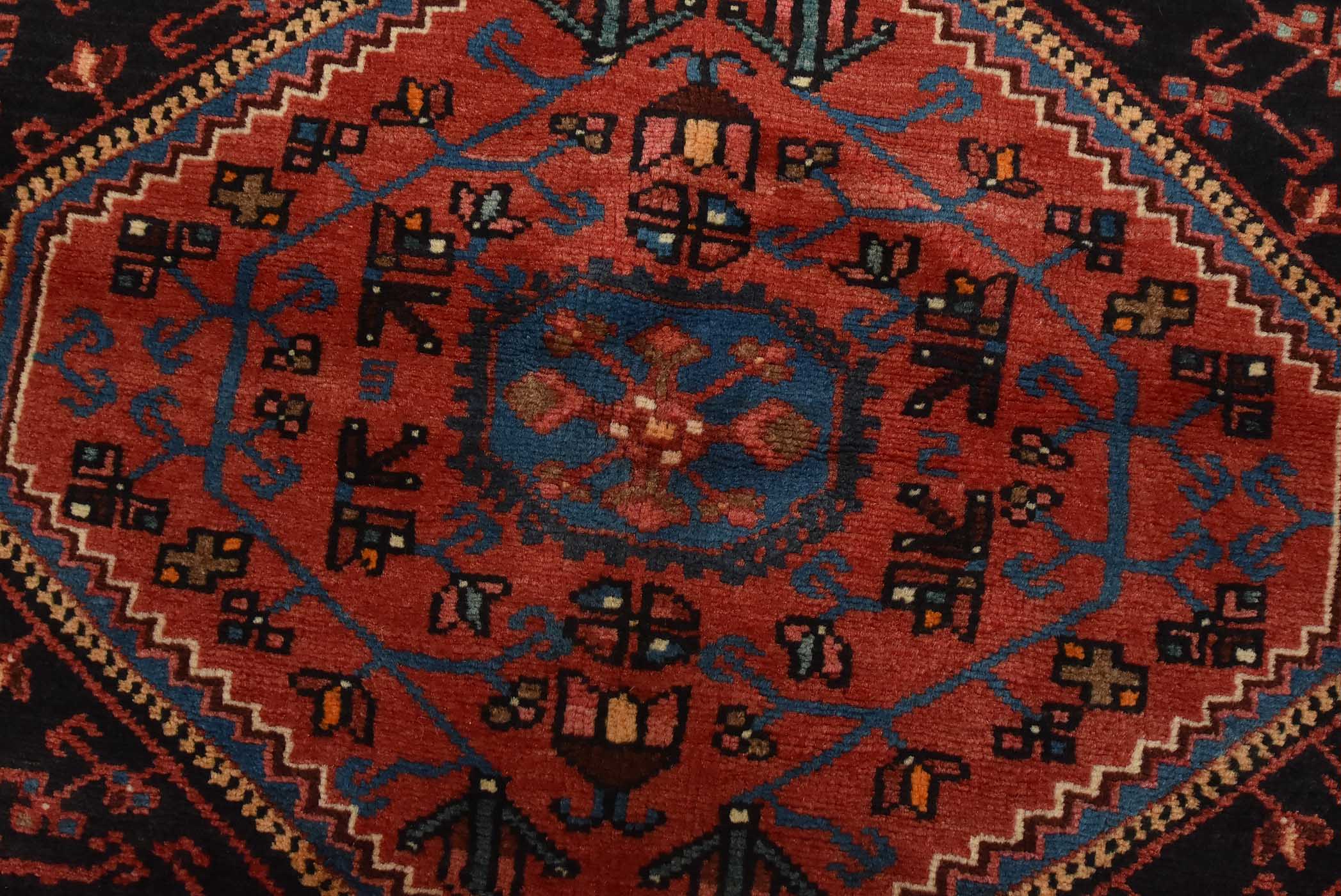 An authentic vintage tribal Zanjan rug hand-knotted with fine wool and natural dyes. This nomadic rug features a central geometric medallion surrounded by a geometric botanical design set against a blue background. It has a full wool pile with no worn areas and is in very good condition.