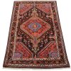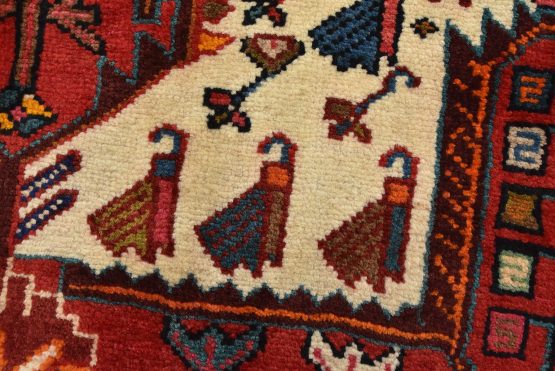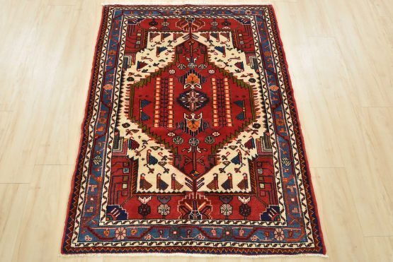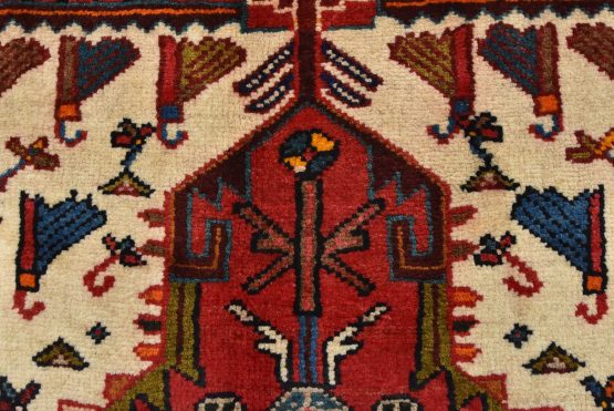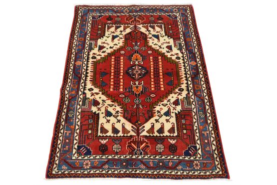 An authentic vintage tribal Zanjan rug hand-knotted with fine wool and natural dyes. This nomadic oriental rug features a central geometric medallion surrounded by small geometric motifs set against an ivory background. It has a full wool pile with no worn areas and is in very good condition.