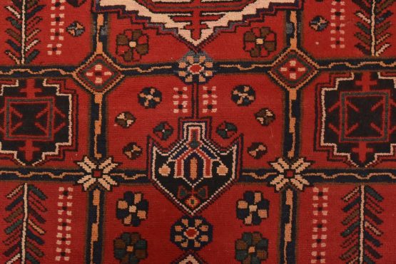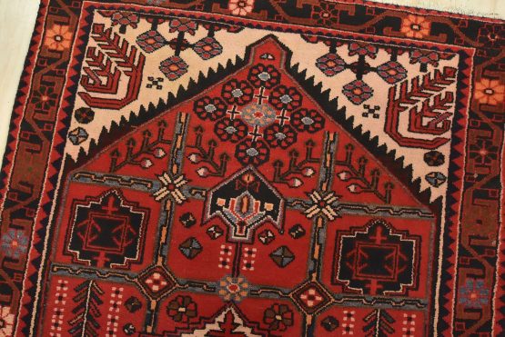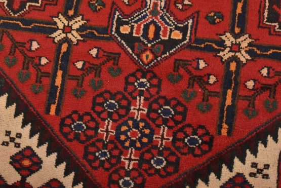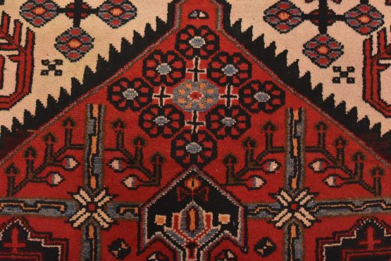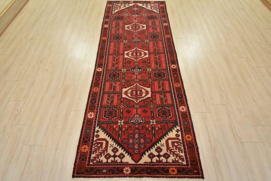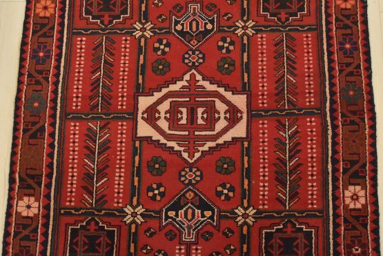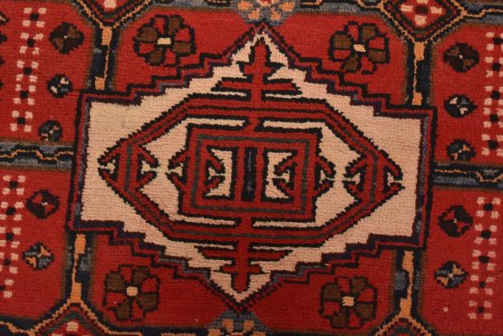 An authentic, vintage, traditional, tribal Zanjan runner hand-knotted with fine wool and natural dyes. This oriental rug features a row of geometric medallions surrounded by geometric motifs set against a red background. The wool pile shows some minor wear; please refer to the photos. Otherwise, the rug is in very good condition.