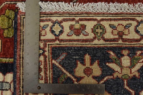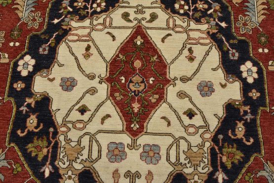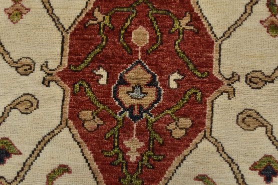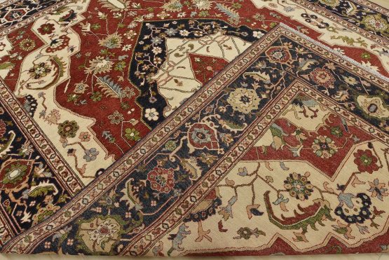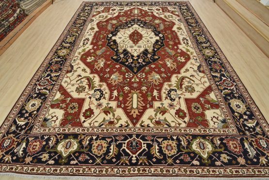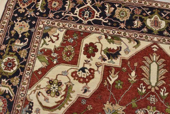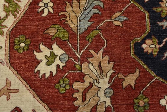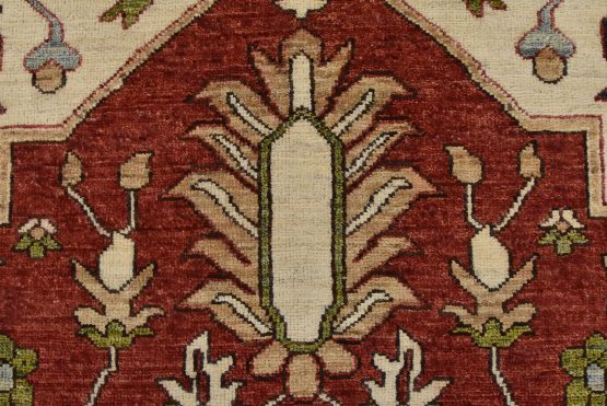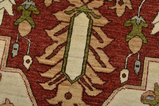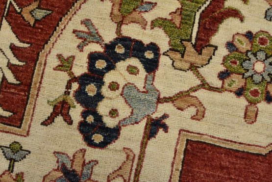 A traditional Heriz Ziegler rug hand-knotted with an all-wool pile on a cotton foundation. This finely woven oriental rug features a central medallion surrounded by botanical designs set against a red background. It is new and in excellent condition.
