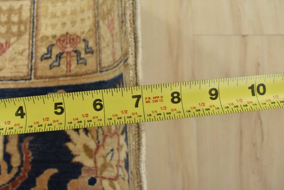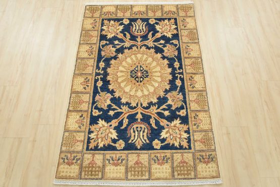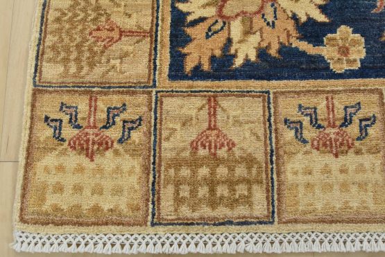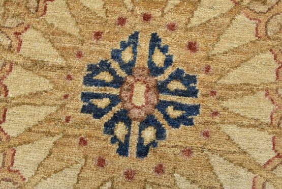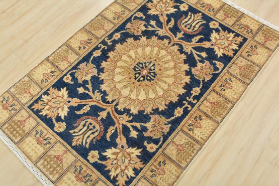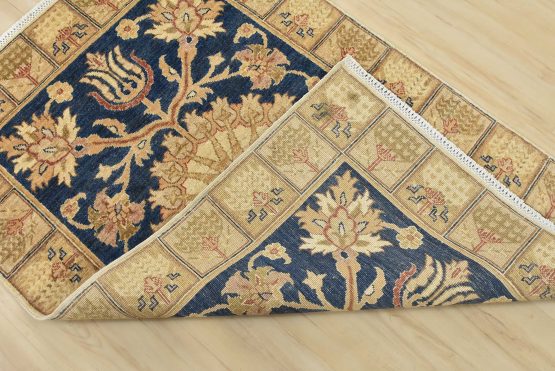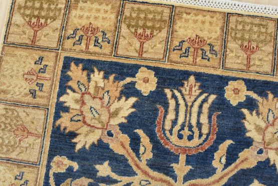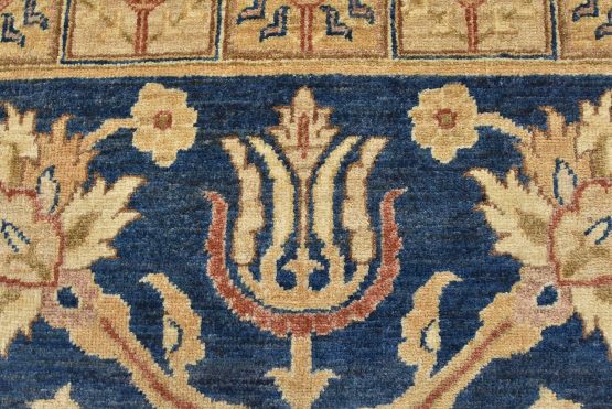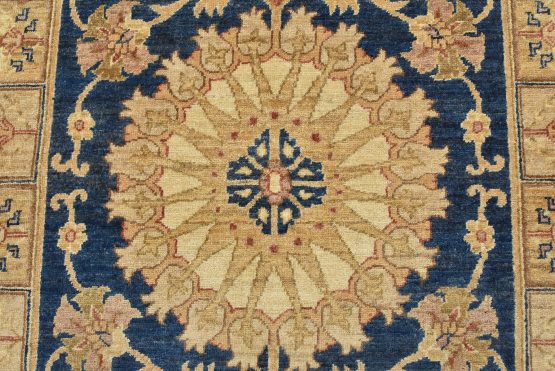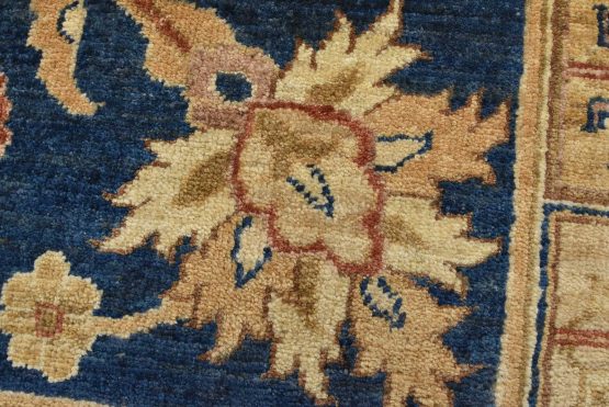 A traditional Ziegler rug hand-knotted with an all-wool pile on a cotton foundation. This oriental rug features a central medallion surrounded by floral motifs set against a blue background. It is new and in excellent condition.