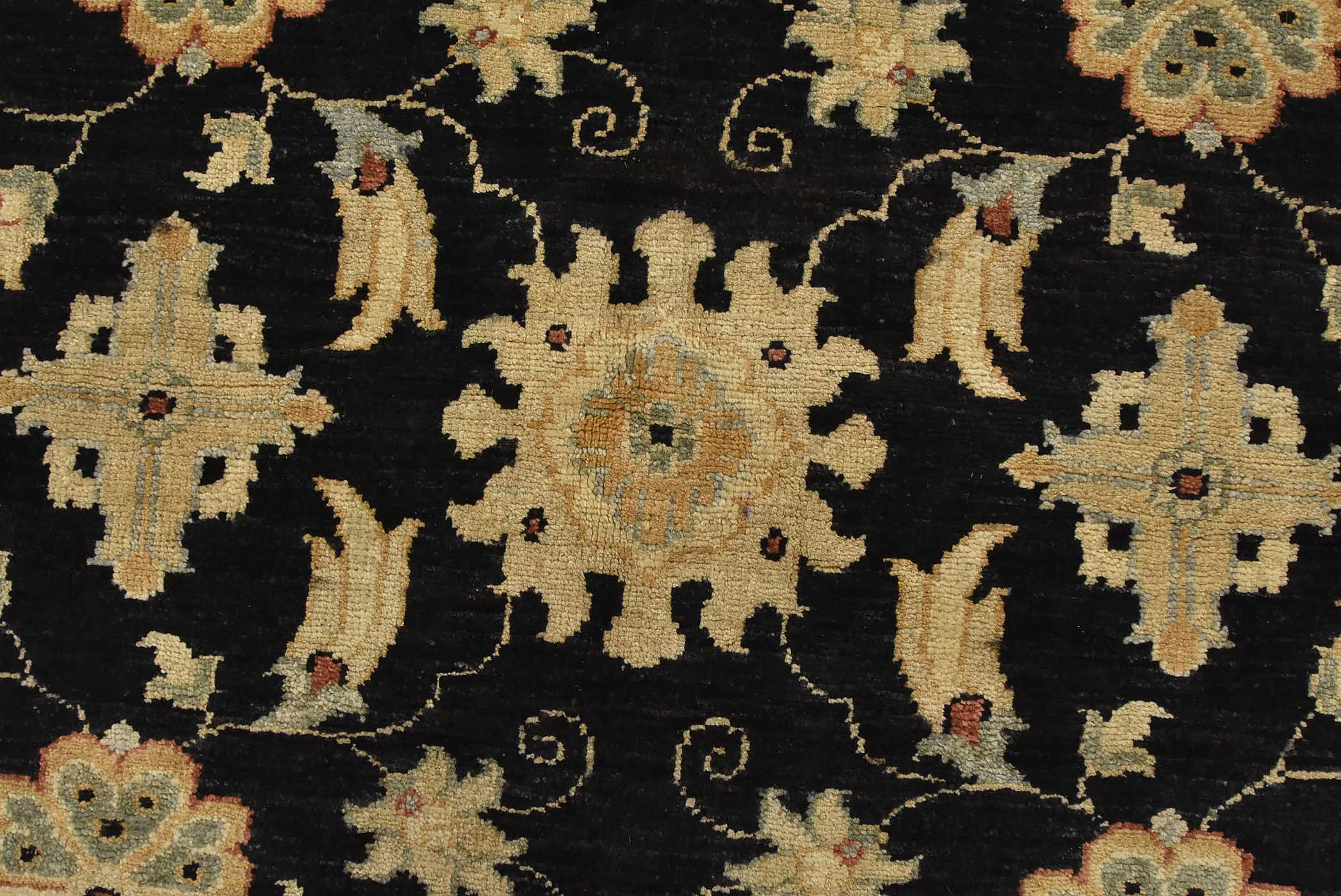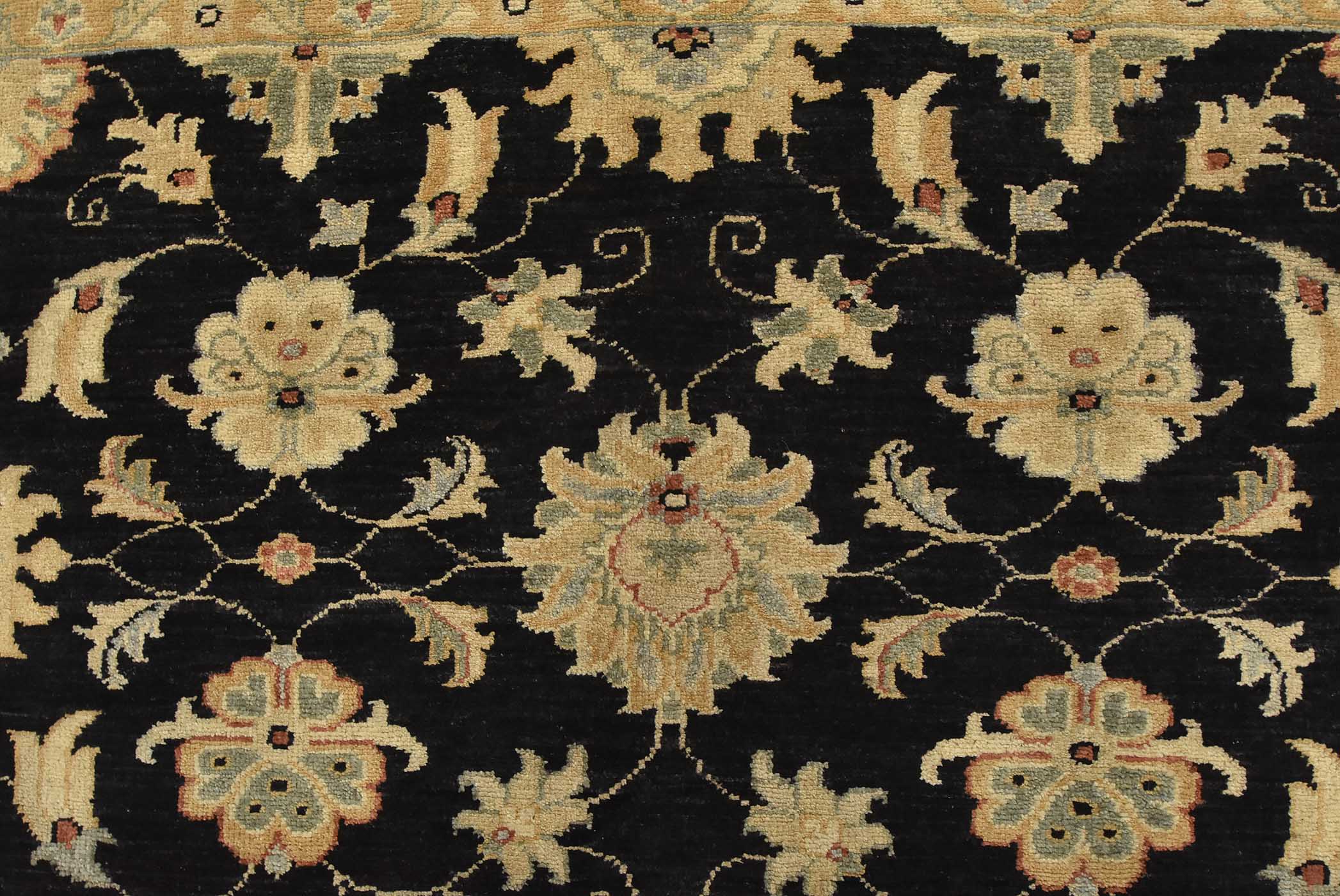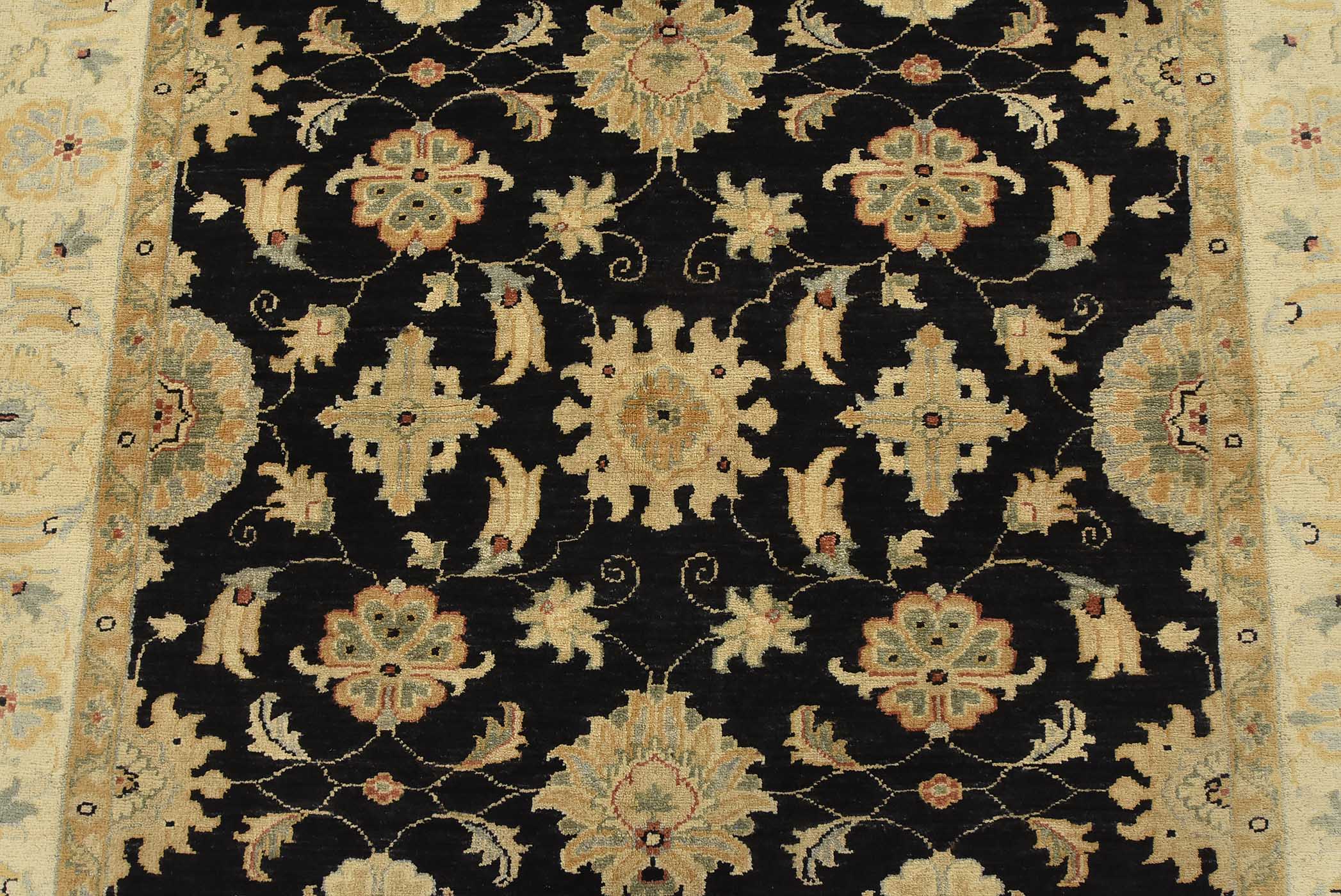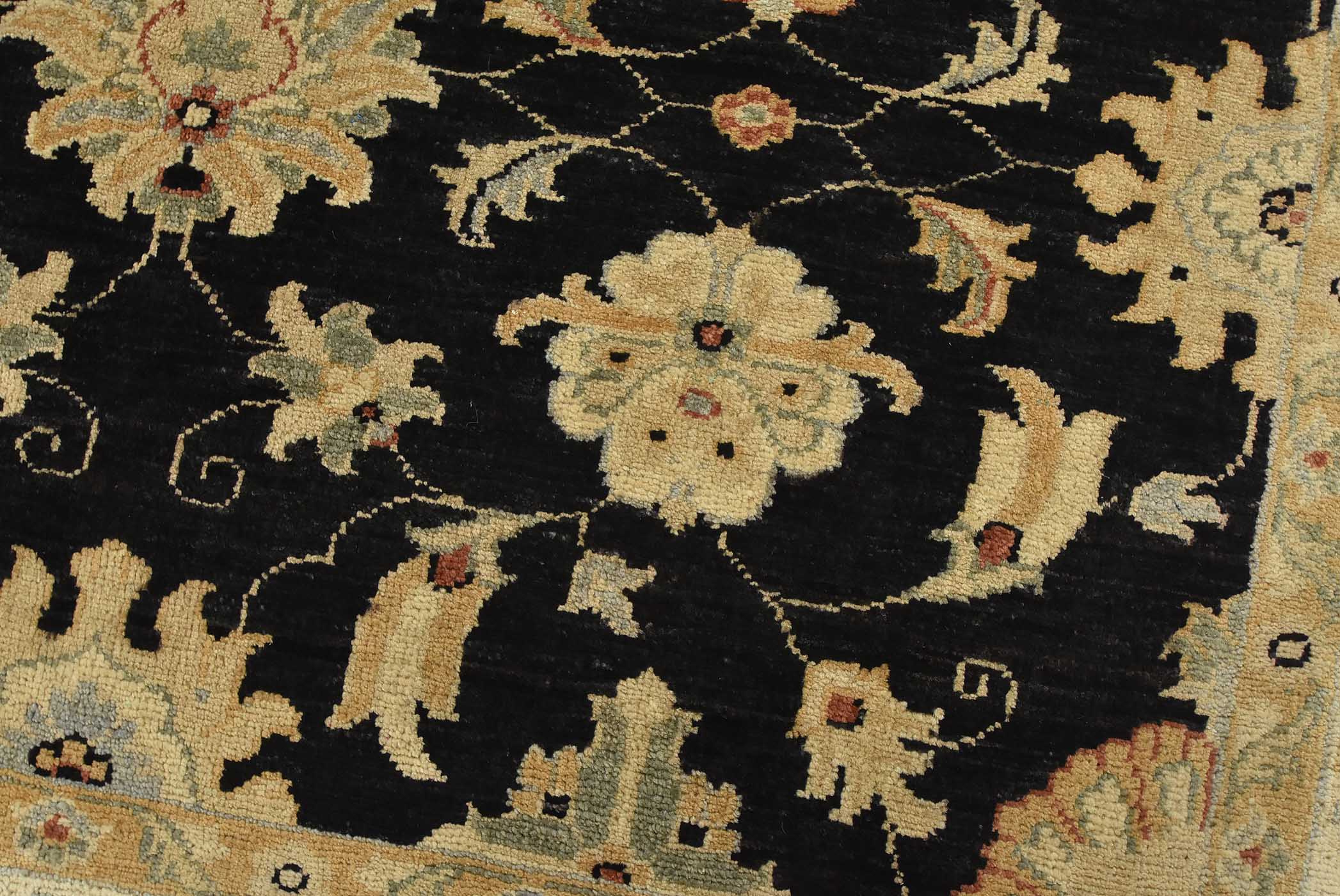 A traditional Ziegler rug hand-knotted with fine wool on a cotton foundation. This rug features an all-over botanical design set against a black background. It is new and in excellent condition.