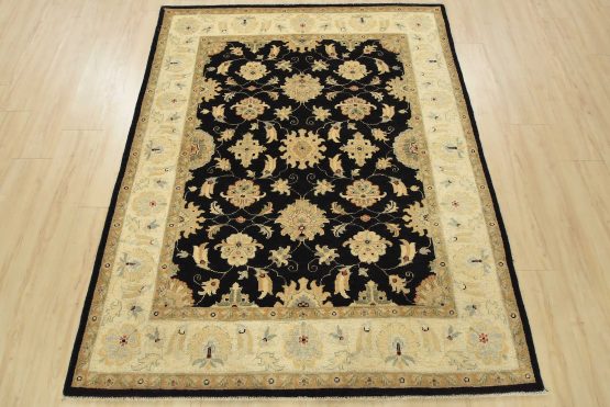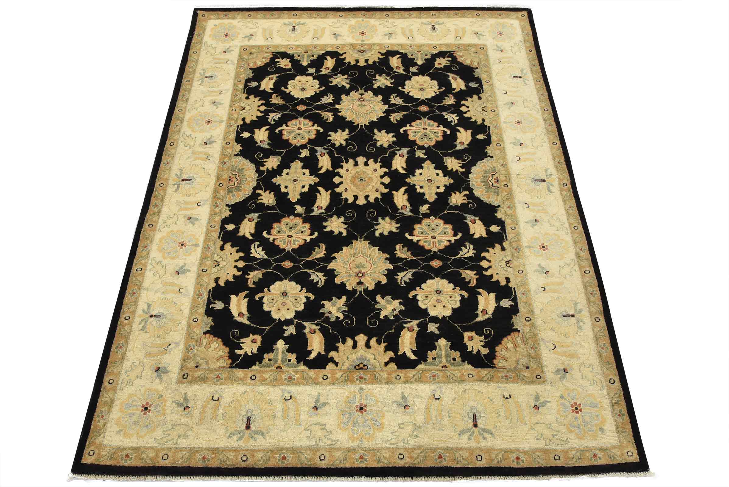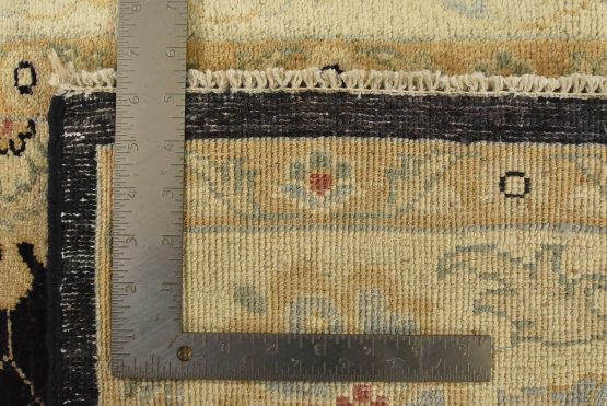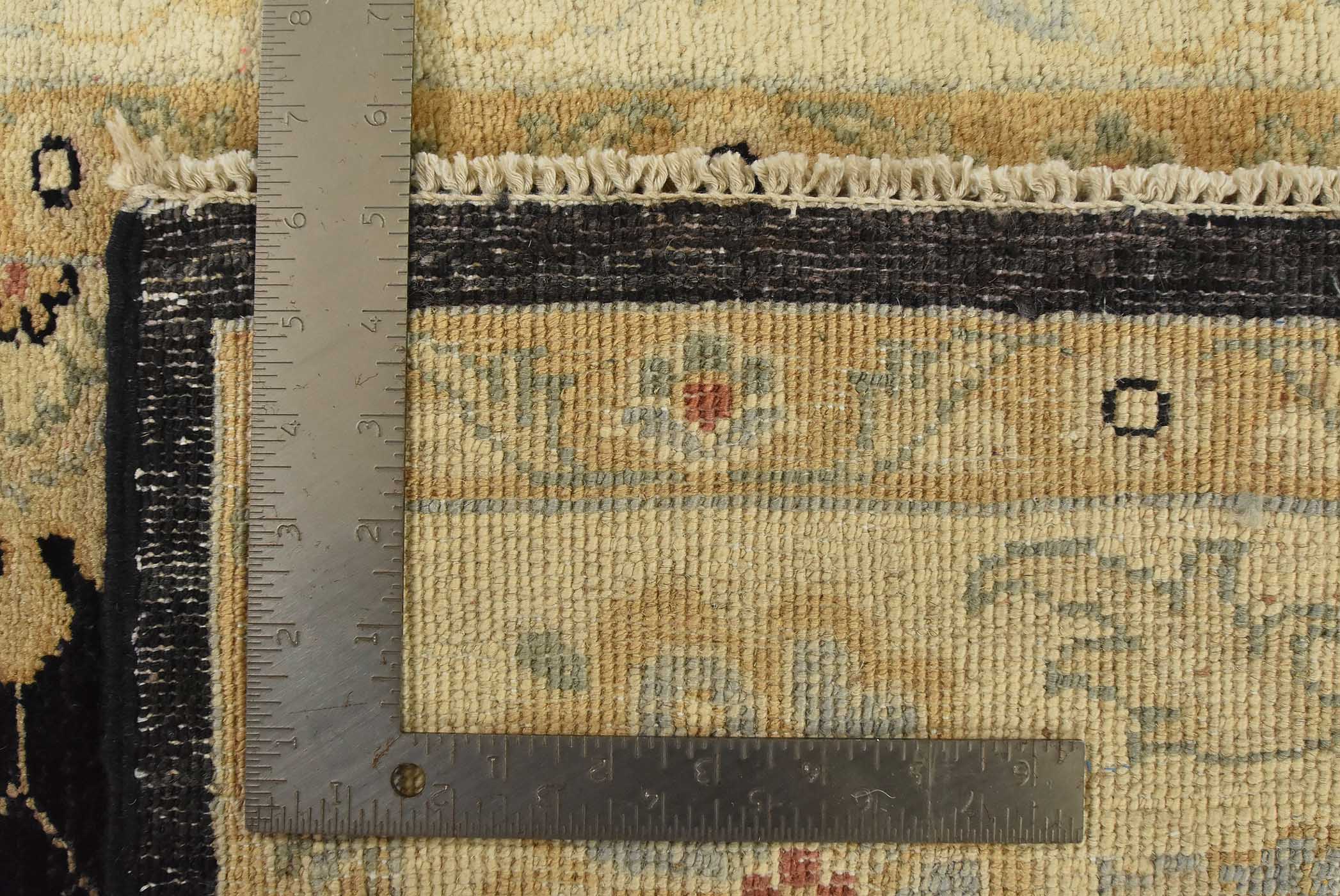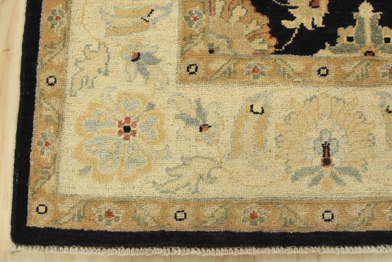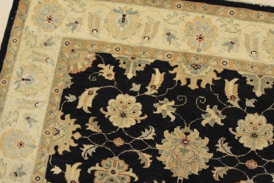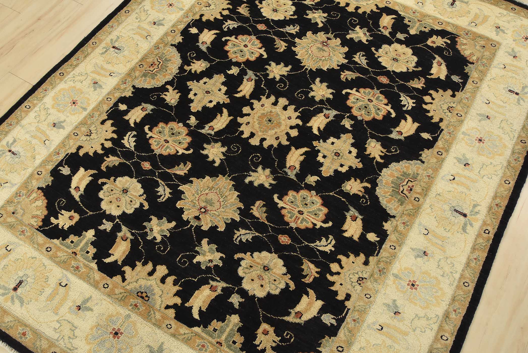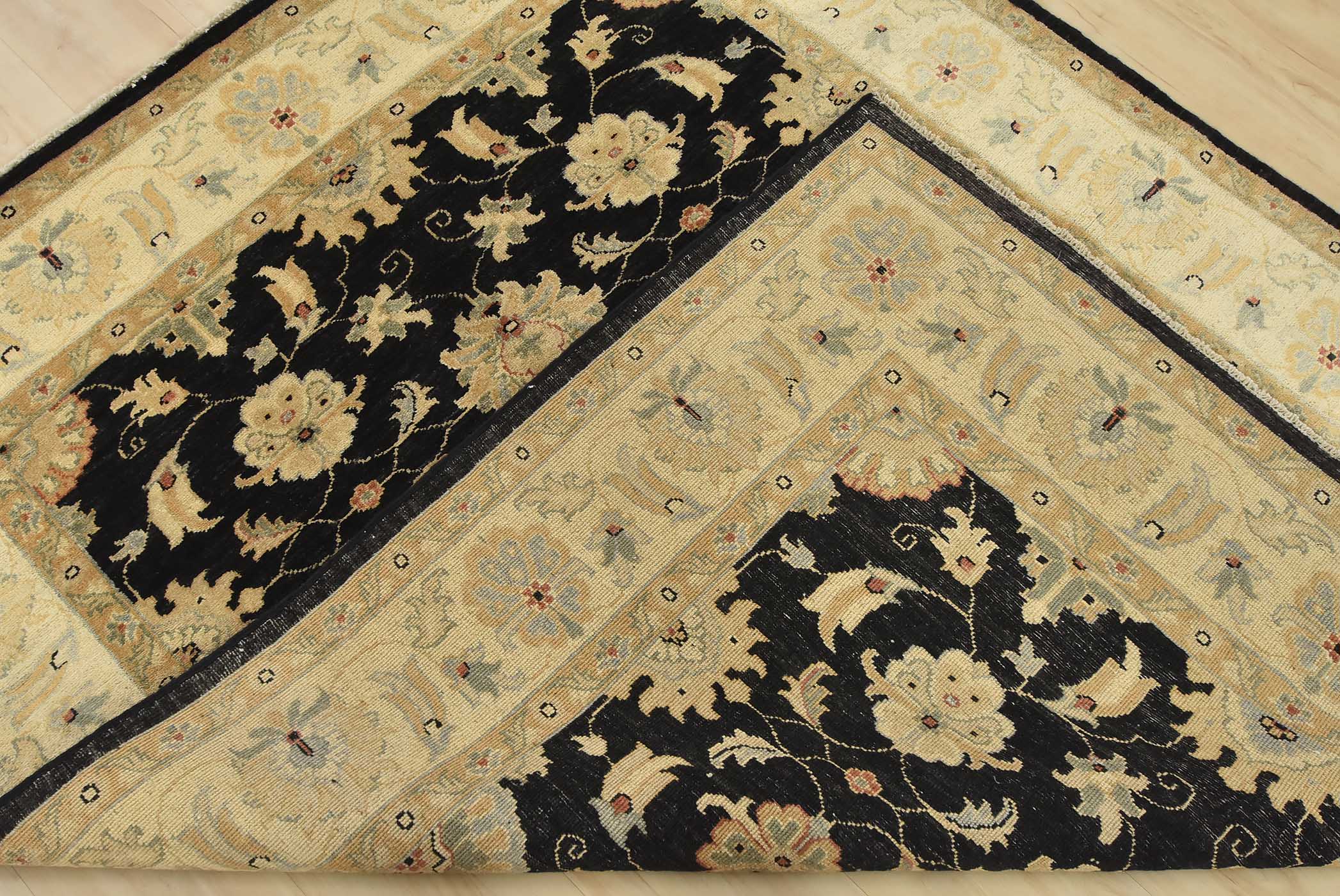 A traditional Ziegler rug hand-knotted with fine wool on a cotton foundation. This rug features an all-over botanical design set against a black background. It is new and in excellent condition.