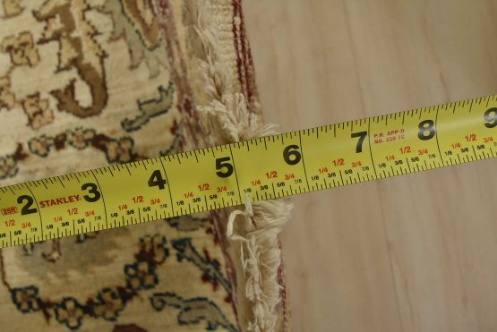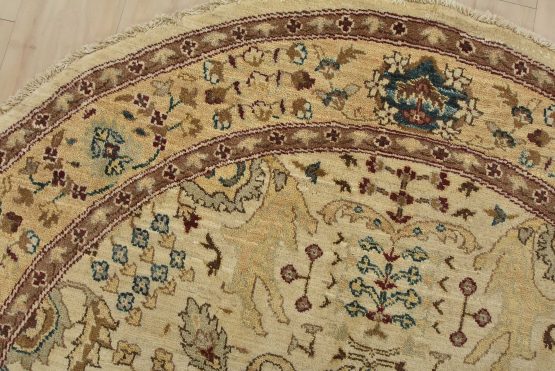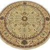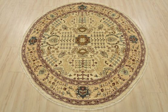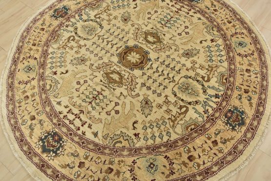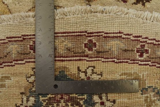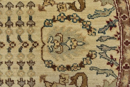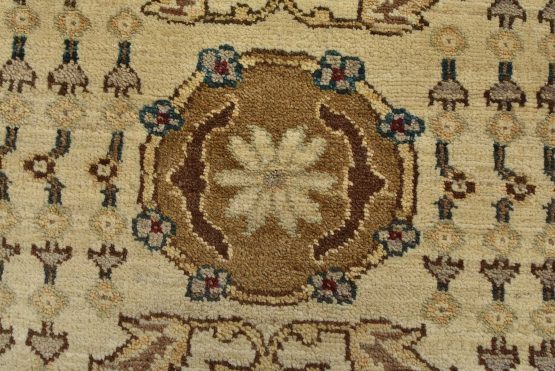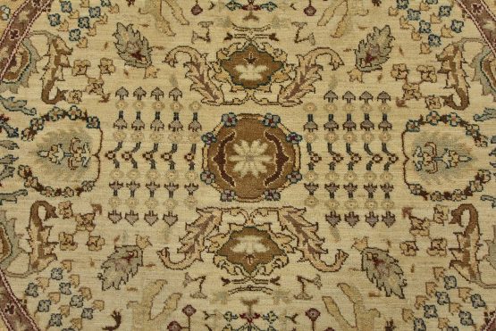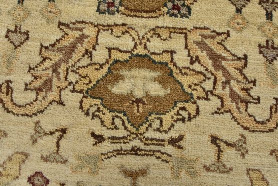 A traditional Ziegler rug hand-knotted with an all-wool pile on a cotton foundation. This oriental rug features a small central medallion surrounded by botanical motifs set against a beige background. It is new and in excellent condition.