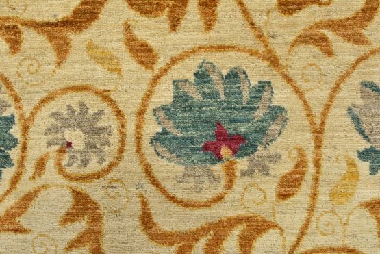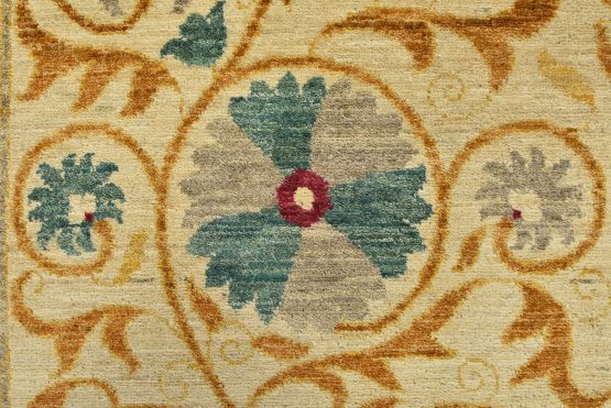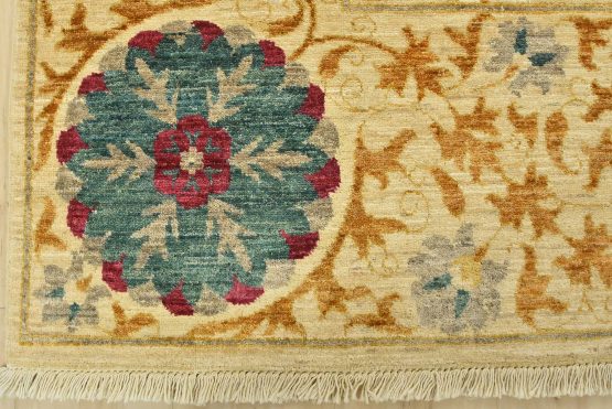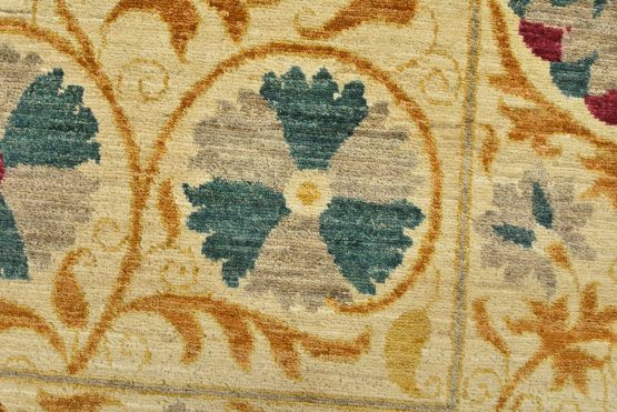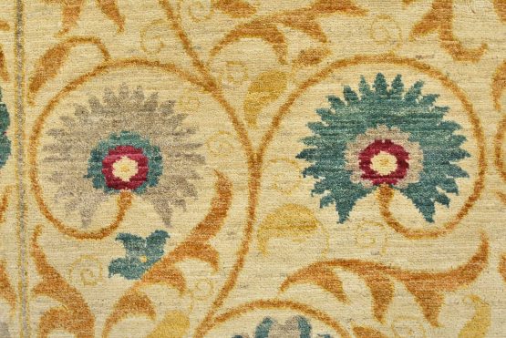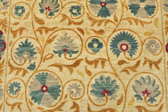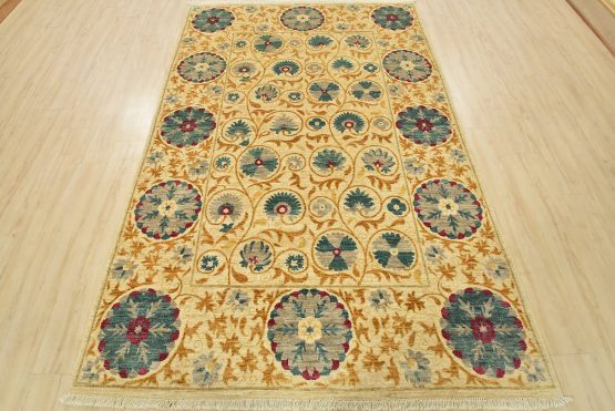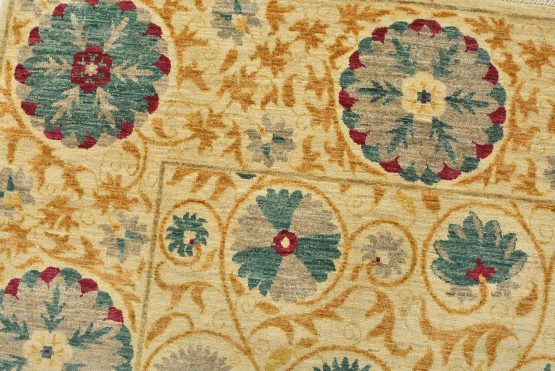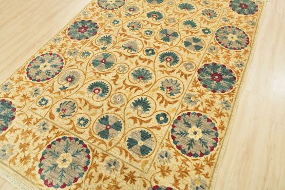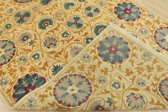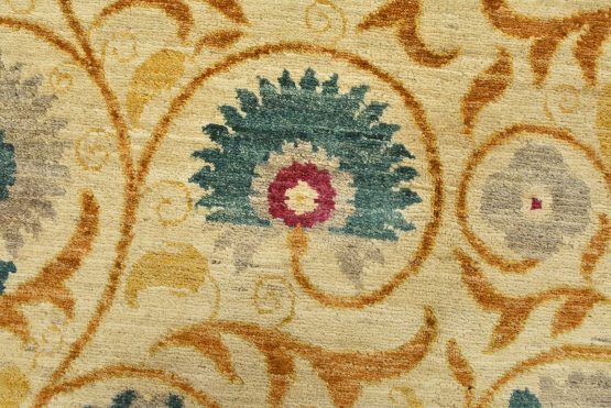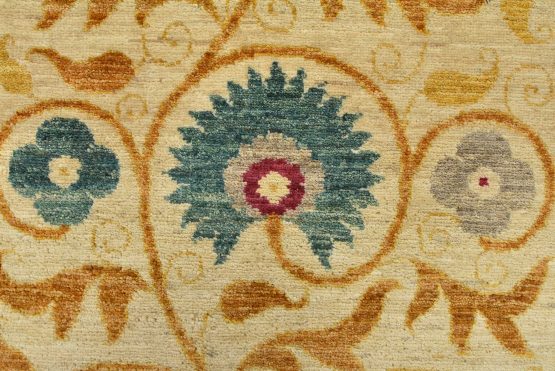 A traditional Suzani rug hand-knotted with an all-wool pile on a cotton foundation. This finely woven oriental rug features an all-over curvilinear botanical floral design set against a beige background. It is new and in excellent condition.