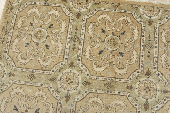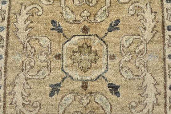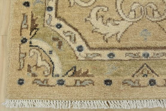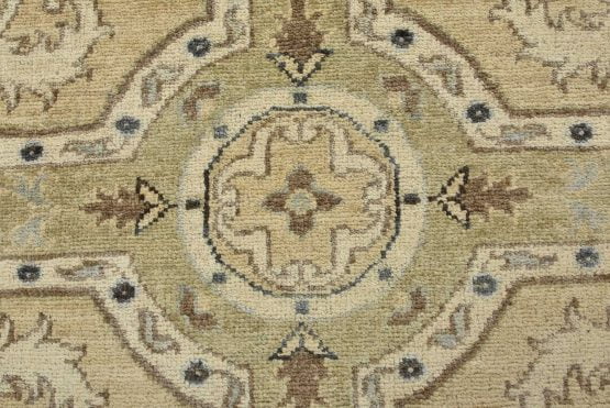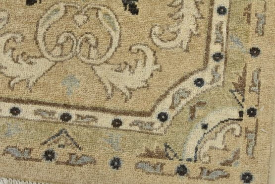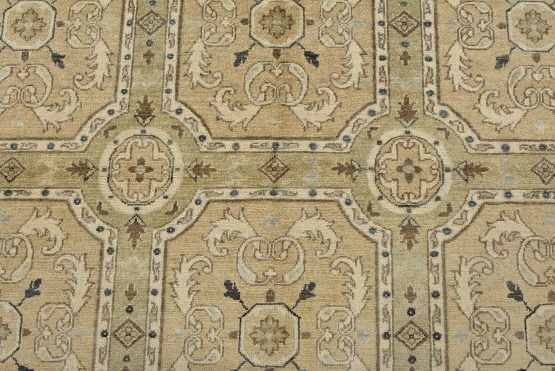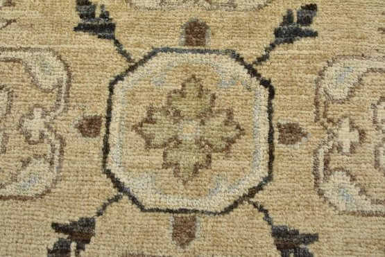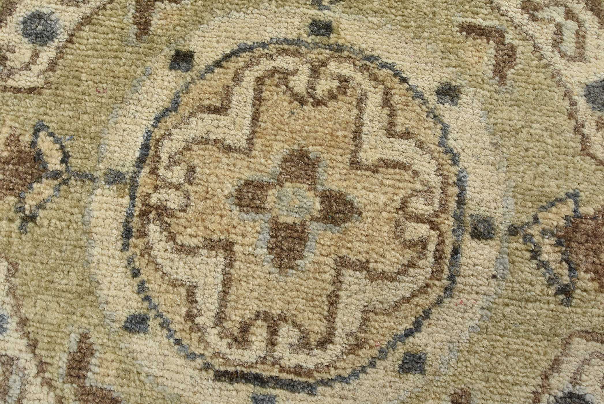 A modern traditional Ziegler rug hand-knotted with an all-wool pile on a cotton foundation. This oriental rug features rows of medallions adorned with botanical motifs set against a beige background. It is new and in excellent condition.