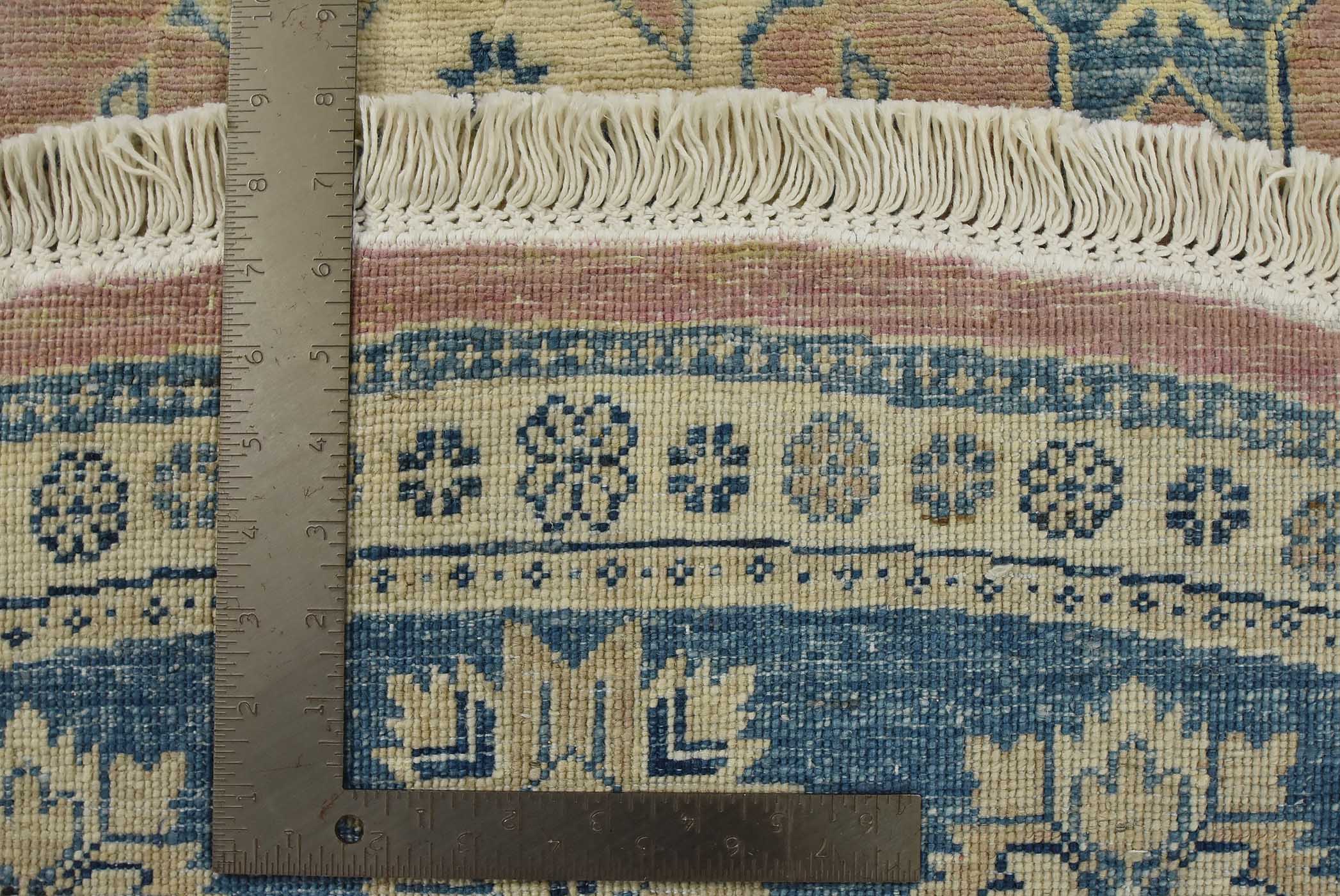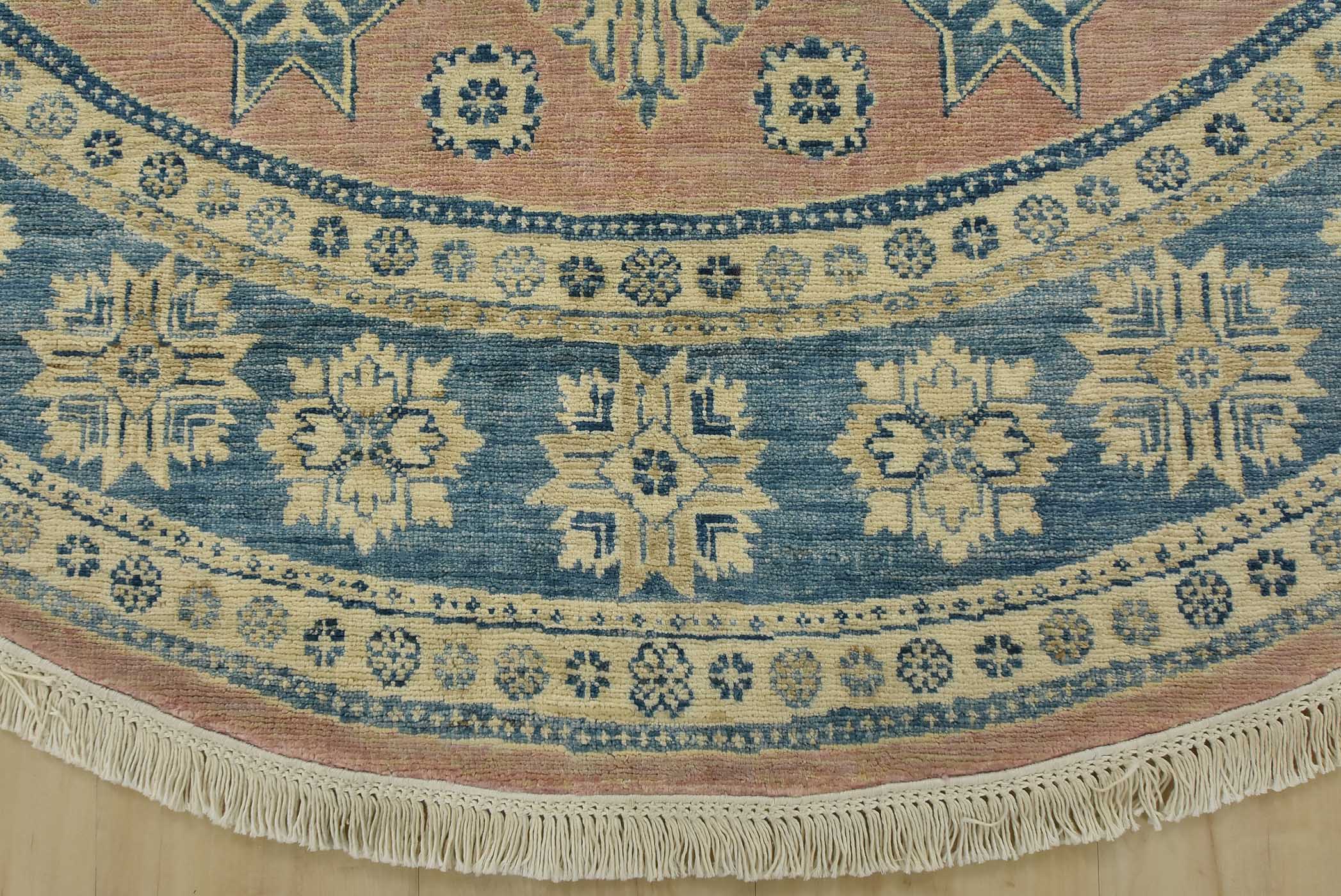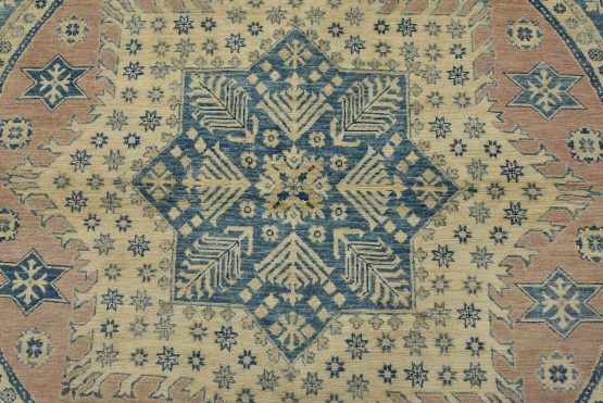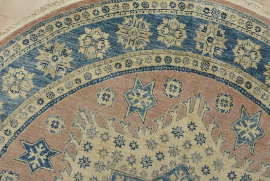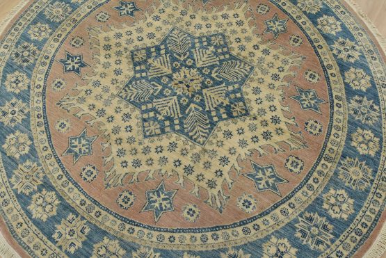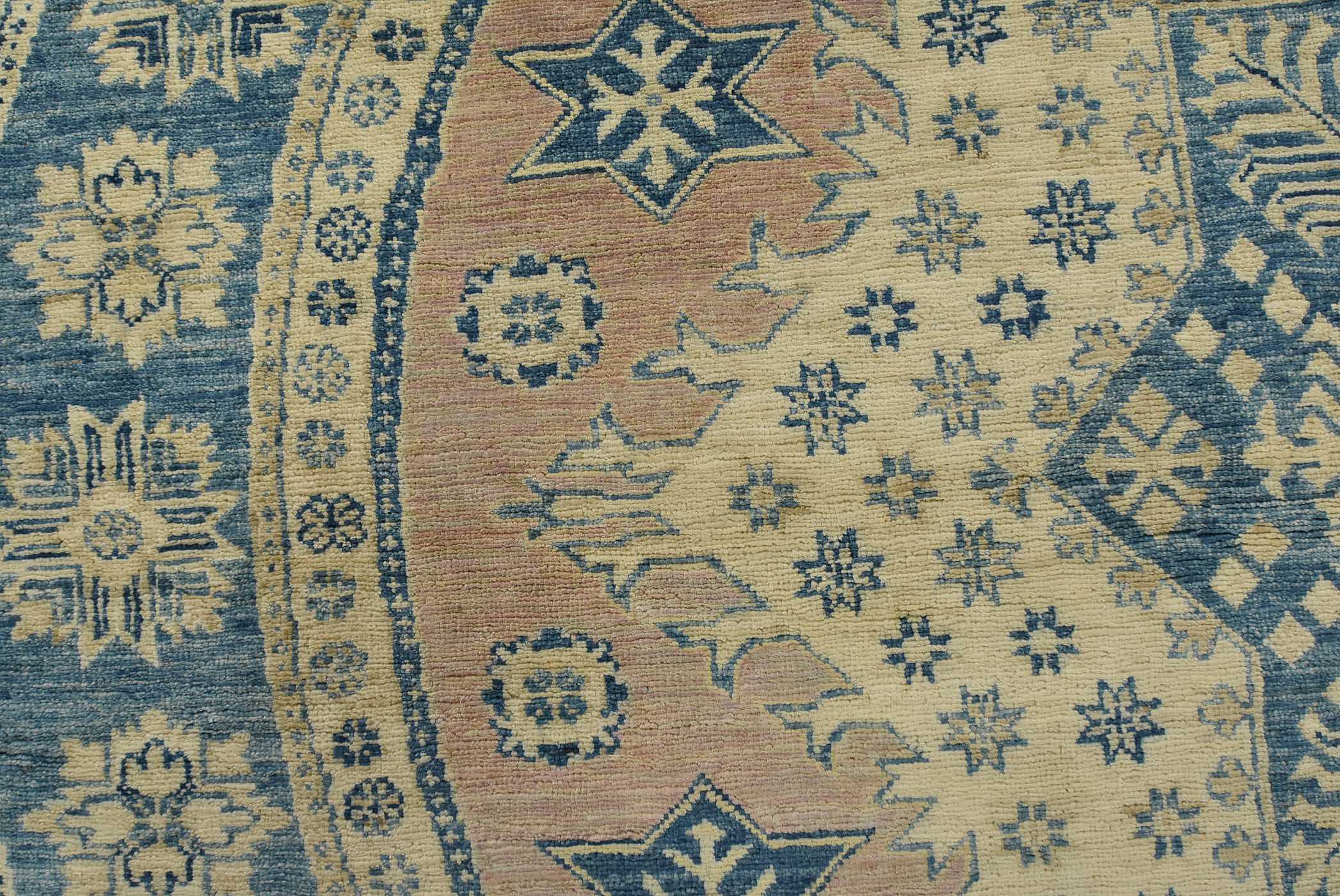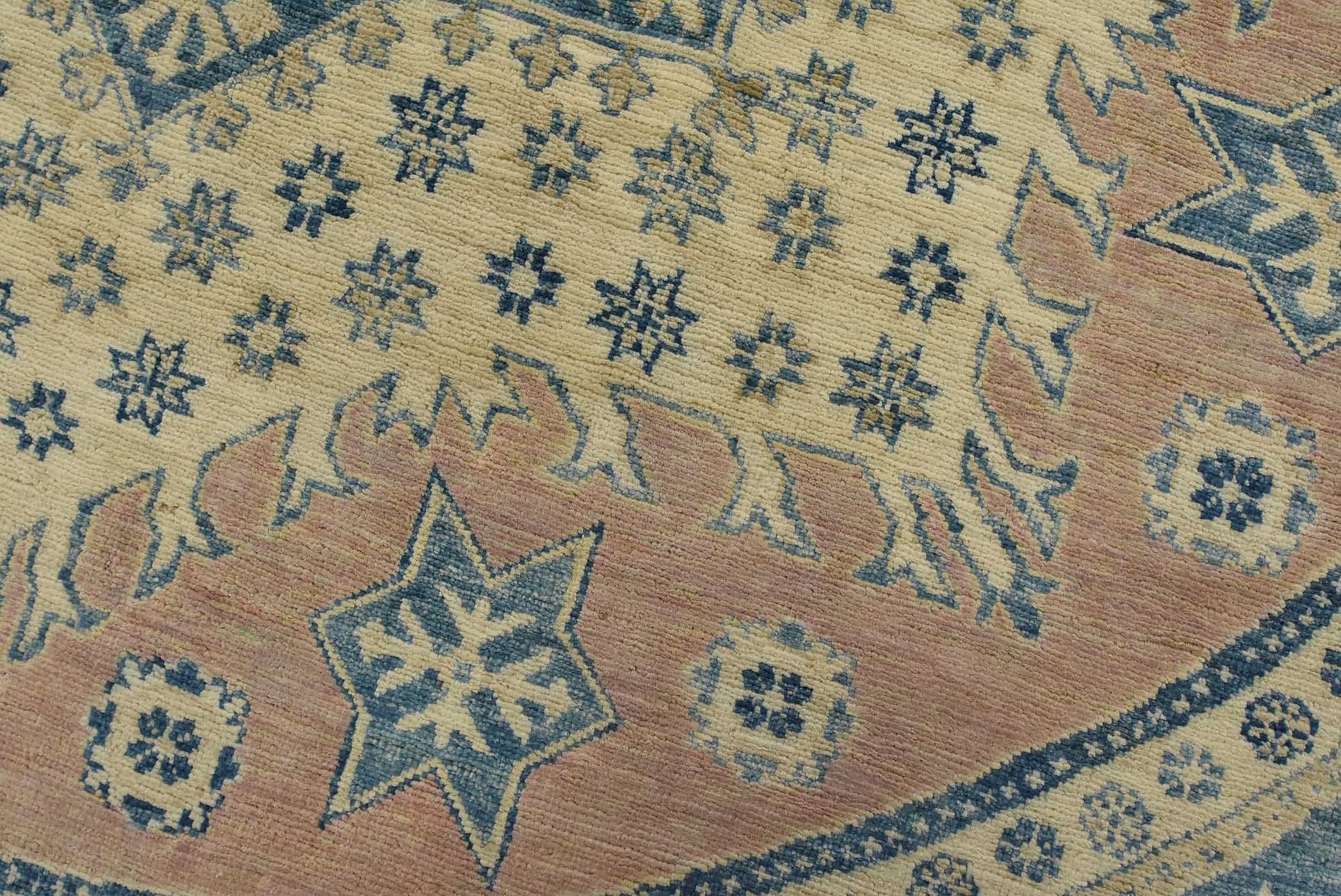 A tribal Ziegler rug hand-knotted with fine wool on a cotton foundation. This rug features a central medallion surrounded by small geometric motifs set against a pink background. It is new and in excellent condition.