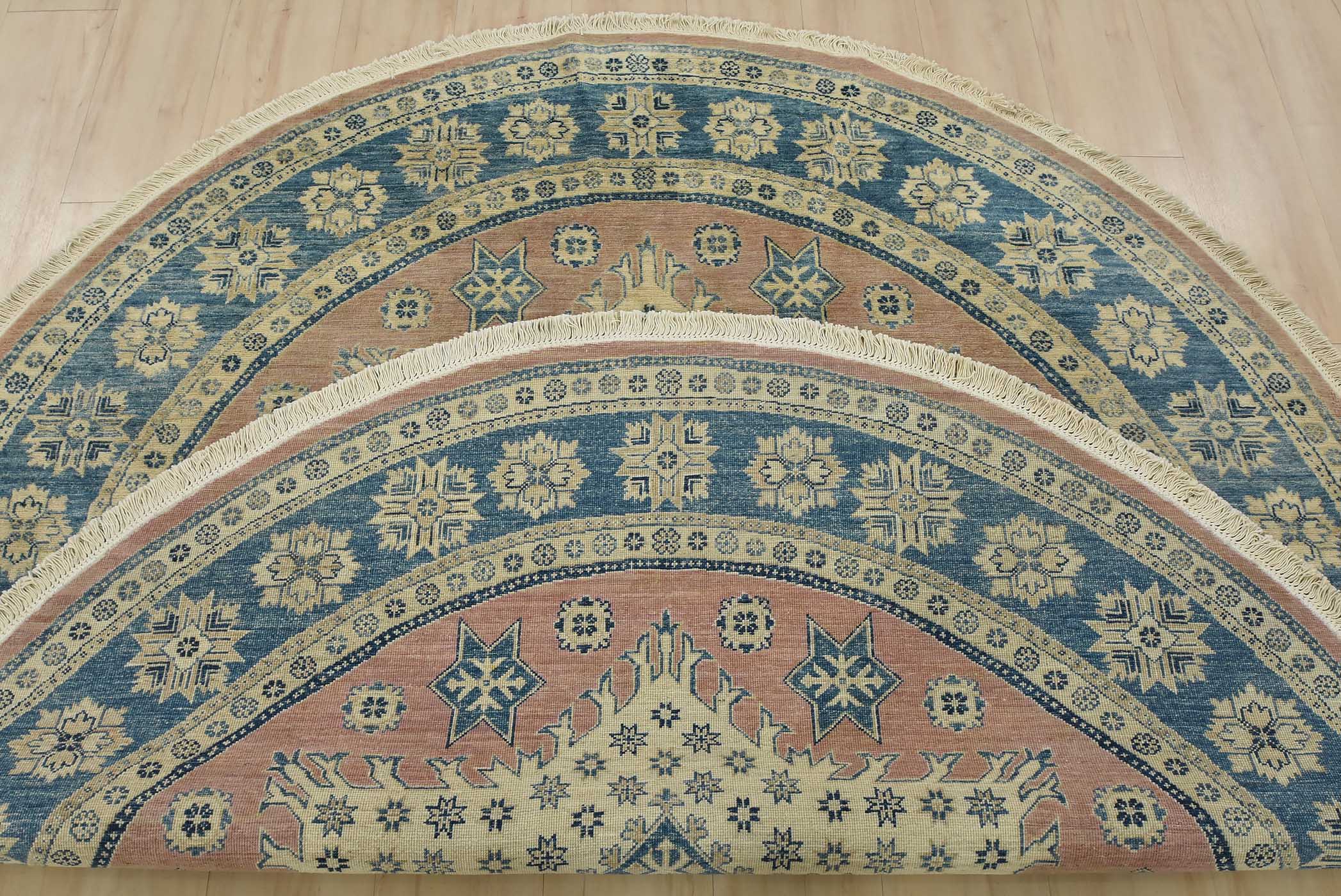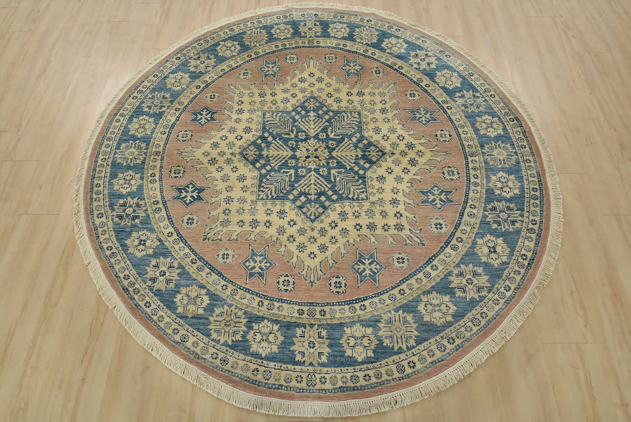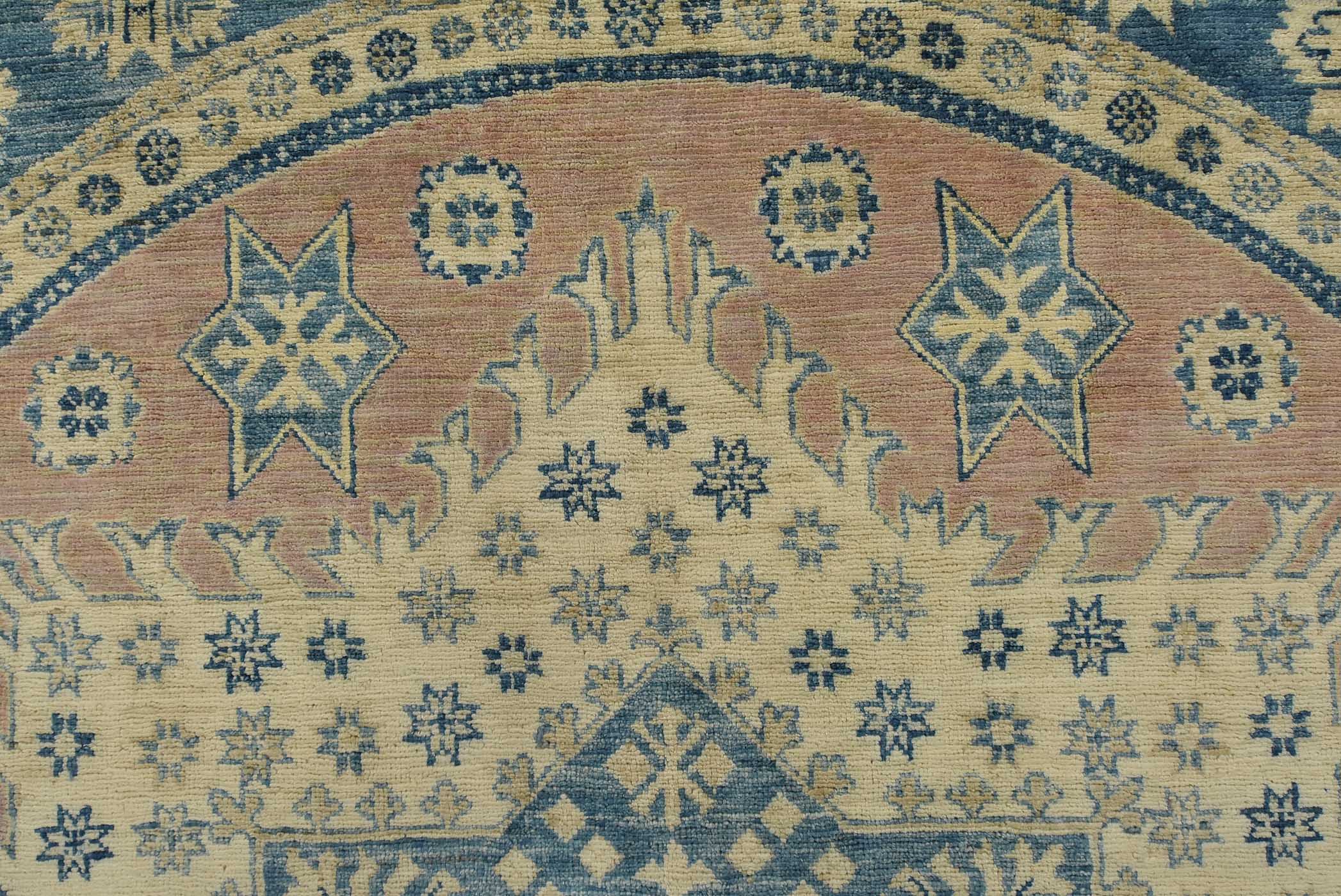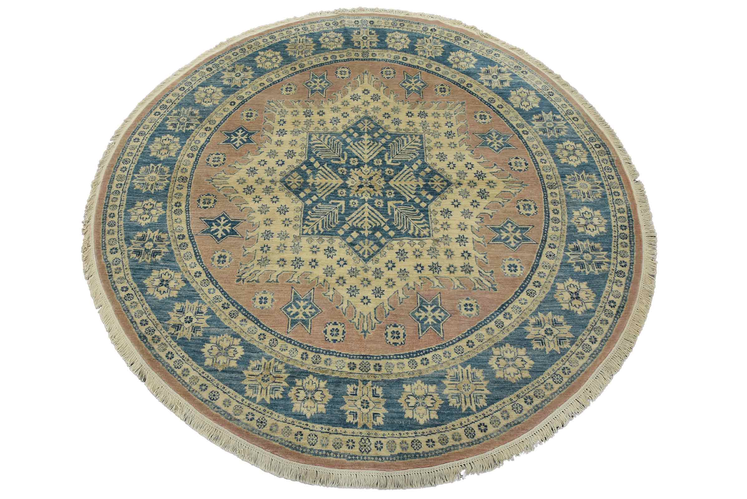 A tribal Ziegler rug hand-knotted with fine wool on a cotton foundation. This rug features a central medallion surrounded by small geometric motifs set against a pink background. It is new and in excellent condition.