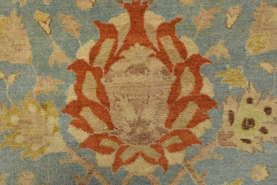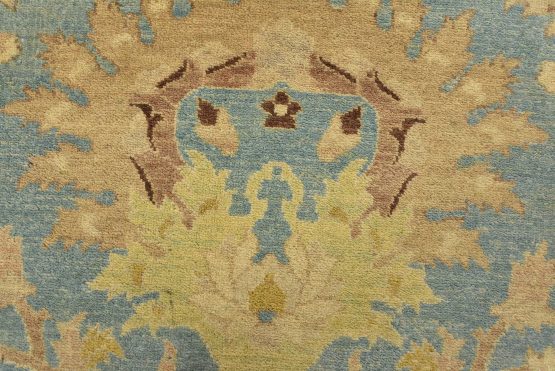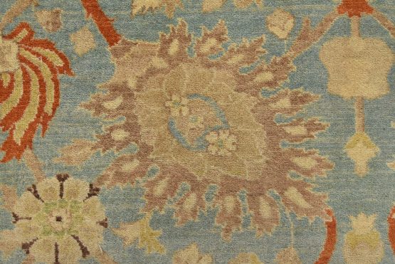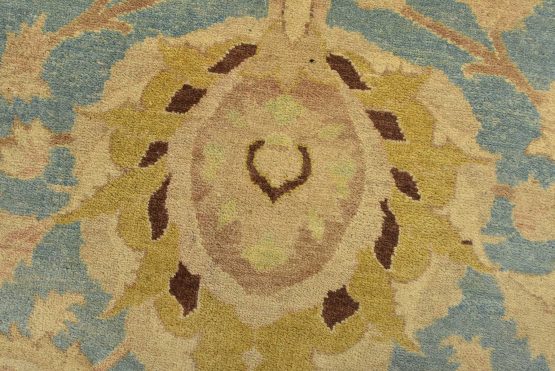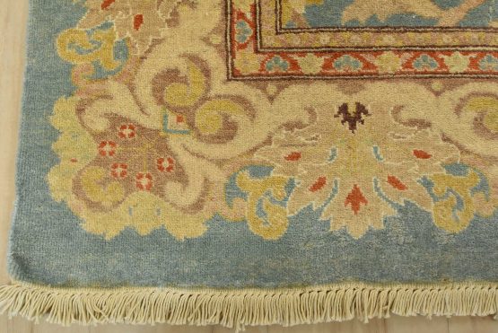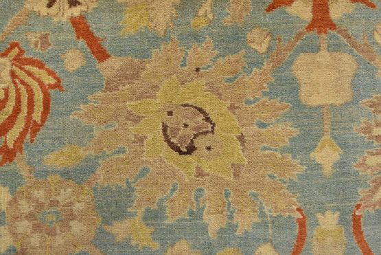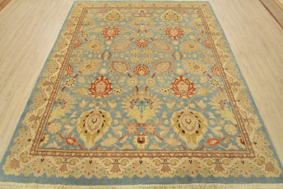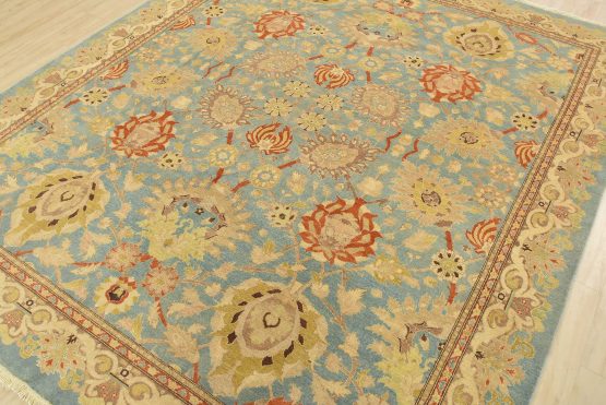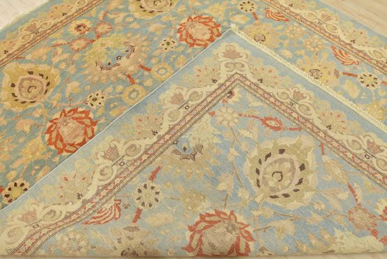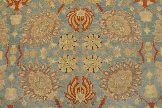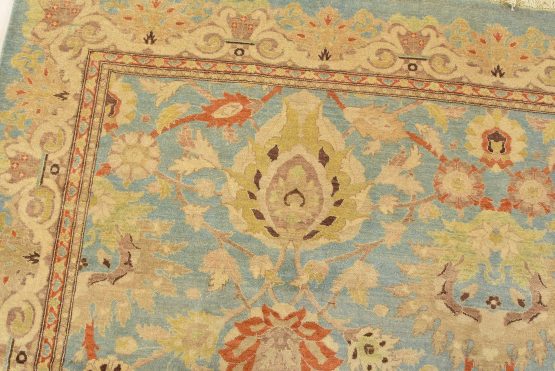 A traditional Tabriz rug hand-knotted with an all-wool pile on a cotton foundation. This finely woven oriental rug features an all-over botanical design set against a light blue background. It is new and in excellent condition.