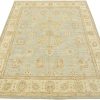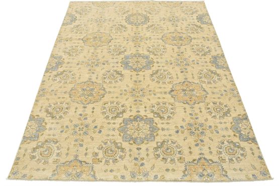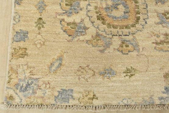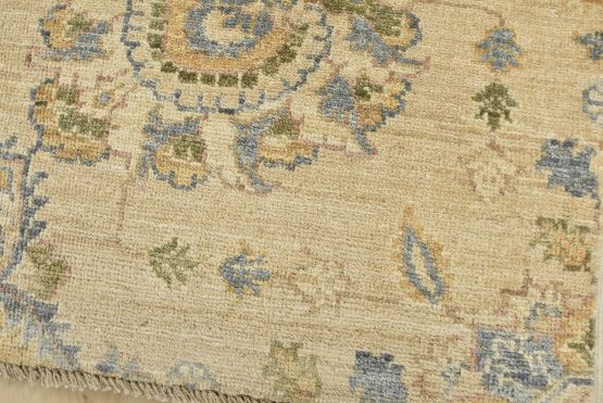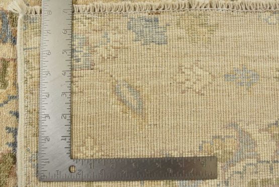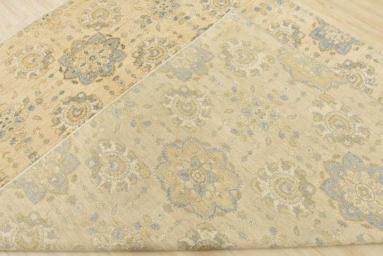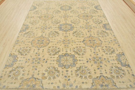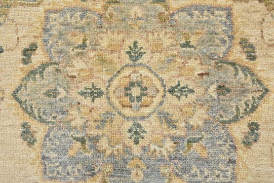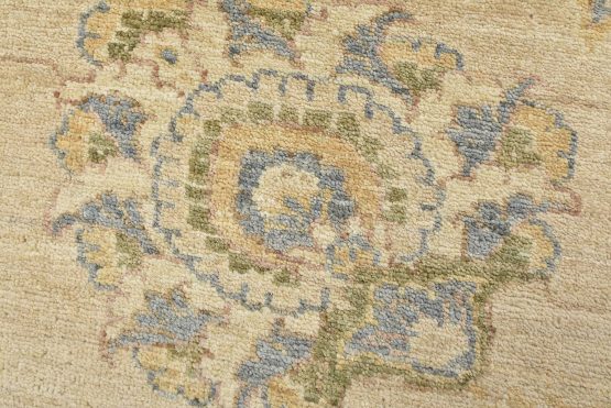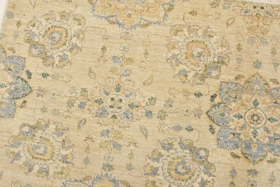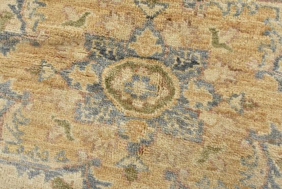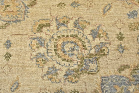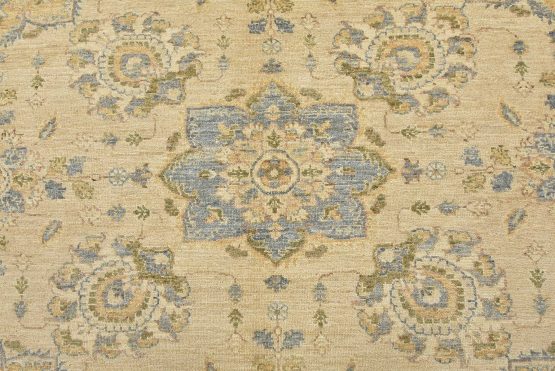 A modern traditional Ziegler rug hand-knotted with an all-wool pile on a cotton foundation. This oriental rug features subtle colors with floral medallions surrounded by botanical designs set against a beige background. It is new and in excellent condition.