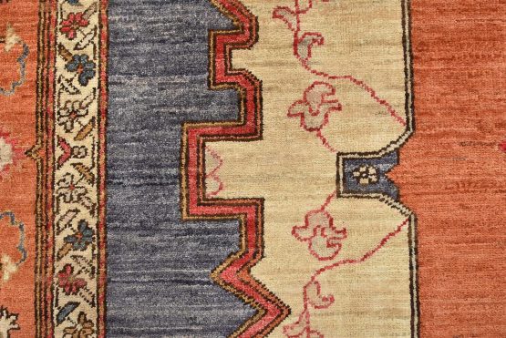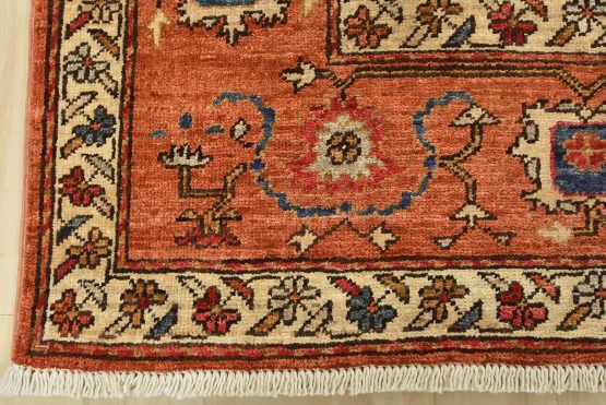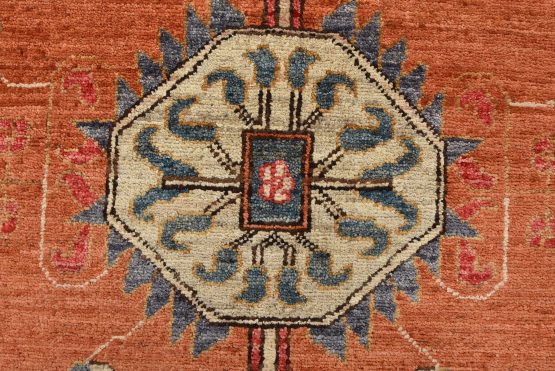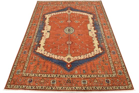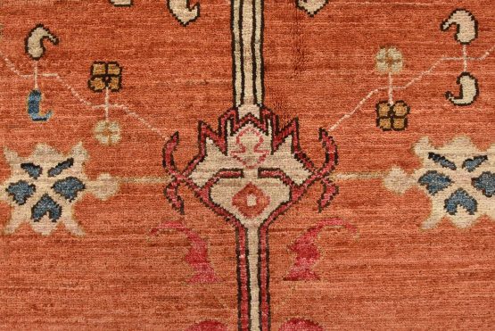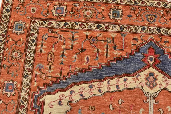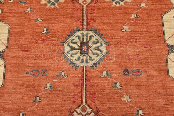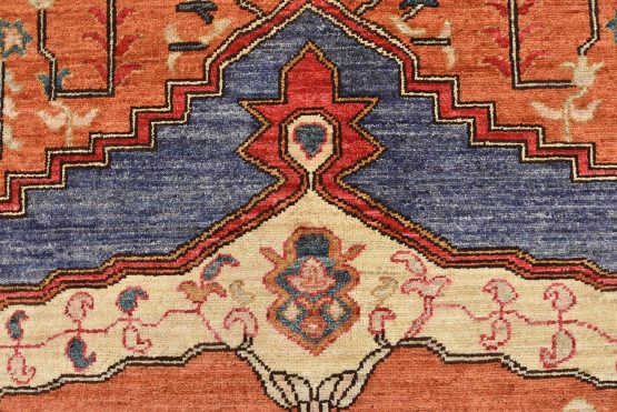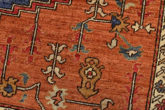 A traditional Heriz Ziegler rug hand-knotted with an all-wool pile on a cotton foundation. This finely woven oriental rug features a small central medallion surrounded by botanical designs set against an orange background. It is new and in excellent condition.