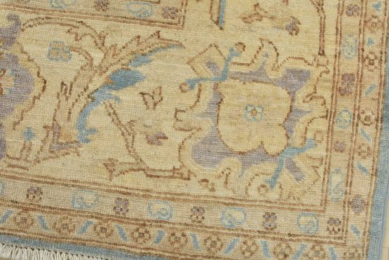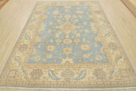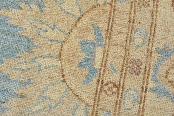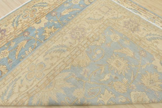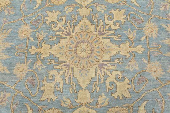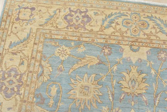 A modern traditional Ziegler rug hand-knotted with an all-wool pile on a cotton foundation. This oriental rug features subtle colors with a central medallion surrounded by floral designs set against a light blue background. It is new and in excellent condition.