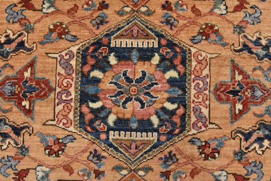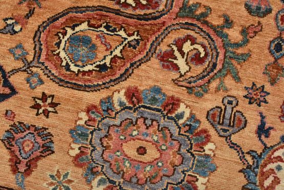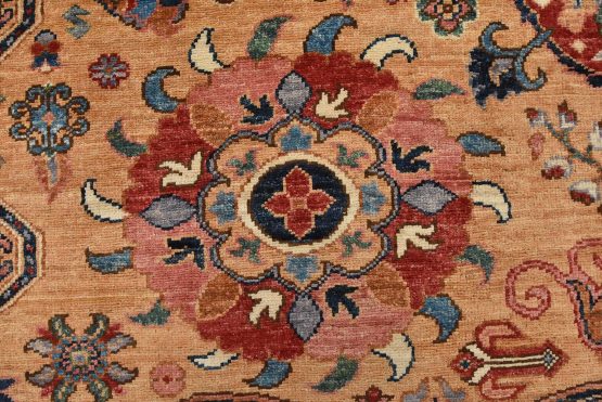 A traditional Ziegler rug hand-knotted with an all-wool pile on a cotton foundation. This finely woven oriental rug features curvilinear medallions surrounded by botanical motifs set against a gold background. It is new and in excellent condition.