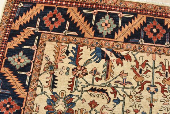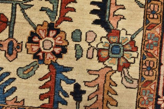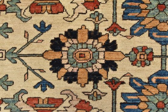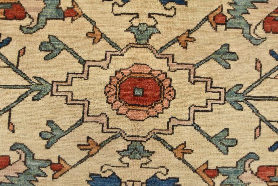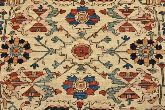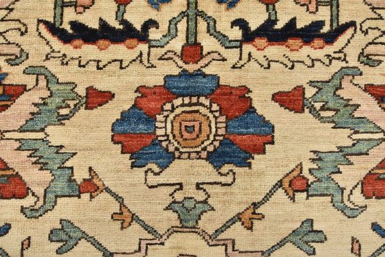 A traditional Heriz Ziegler rug hand-knotted with an all-wool pile on a cotton foundation. This finely woven oriental rug features an all-over geometric botanical design set against a beige background. It is new and in excellent condition.