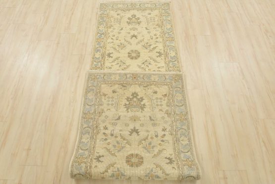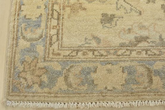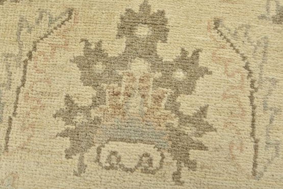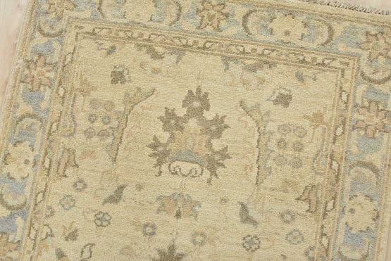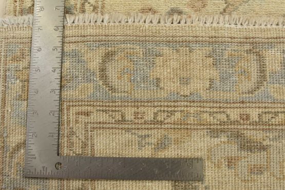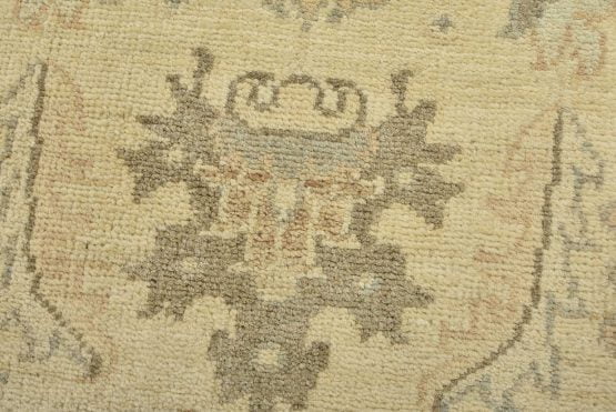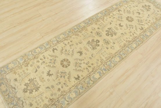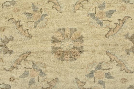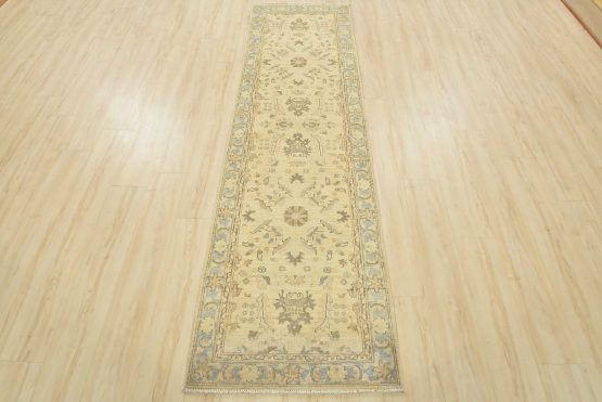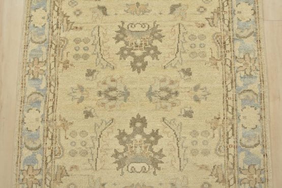 A modern traditional Ziegler runner hand-knotted with an all-wool pile on a cotton foundation. This oriental rug features a subtle botanical design set against a beige background. It is new and in excellent condition.