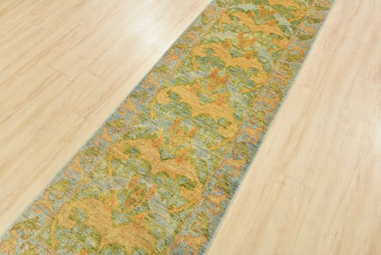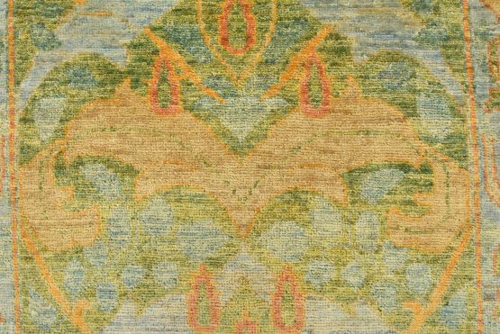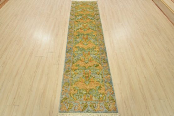 A traditional William Morris runner hand-knotted with an all-wool pile on a cotton foundation. This finely woven oriental rug features a botanical design set against a light blue background. It is new and in excellent condition.