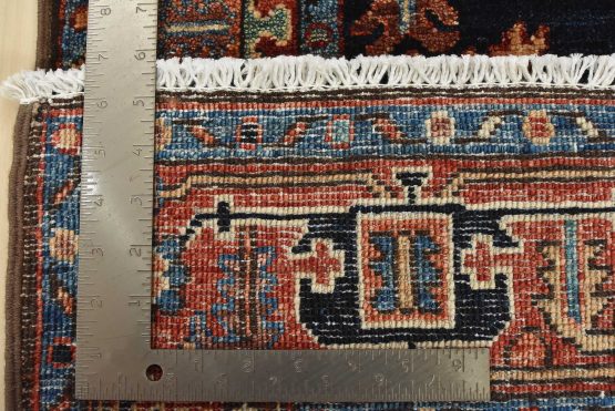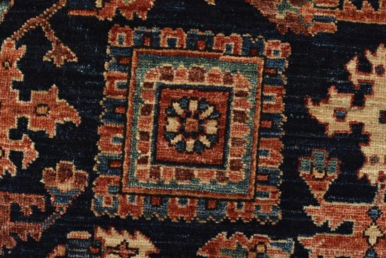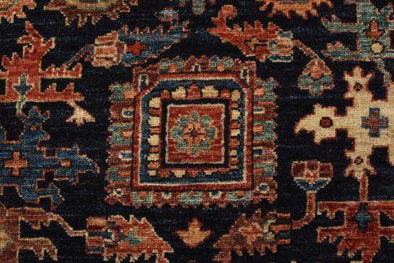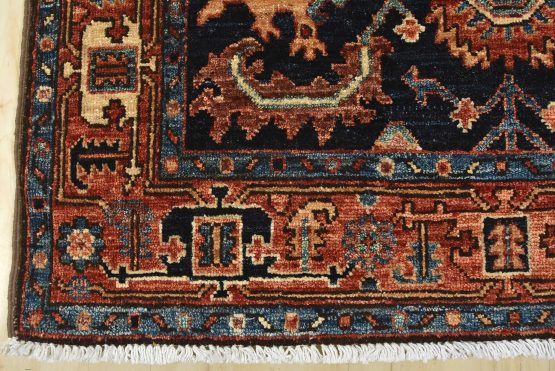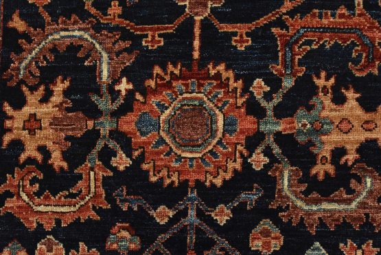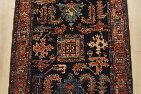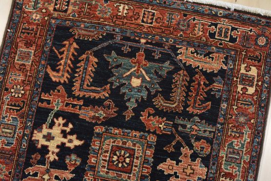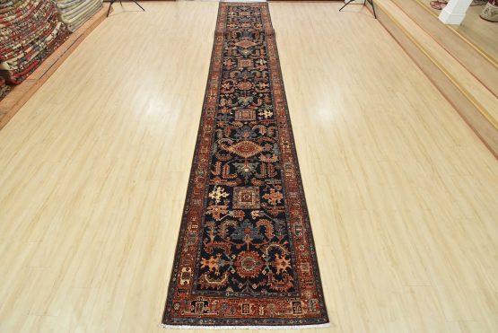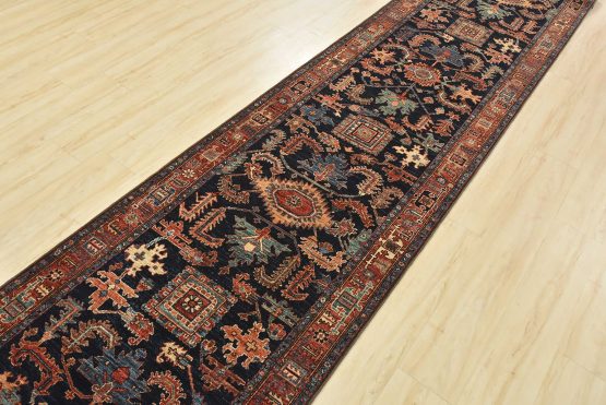 A traditional Heriz Ziegler runner hand-knotted with an all-wool pile on a cotton foundation. This finely woven oriental rug features a geometric botanical design set against a dark blue background. It is new and in excellent condition.